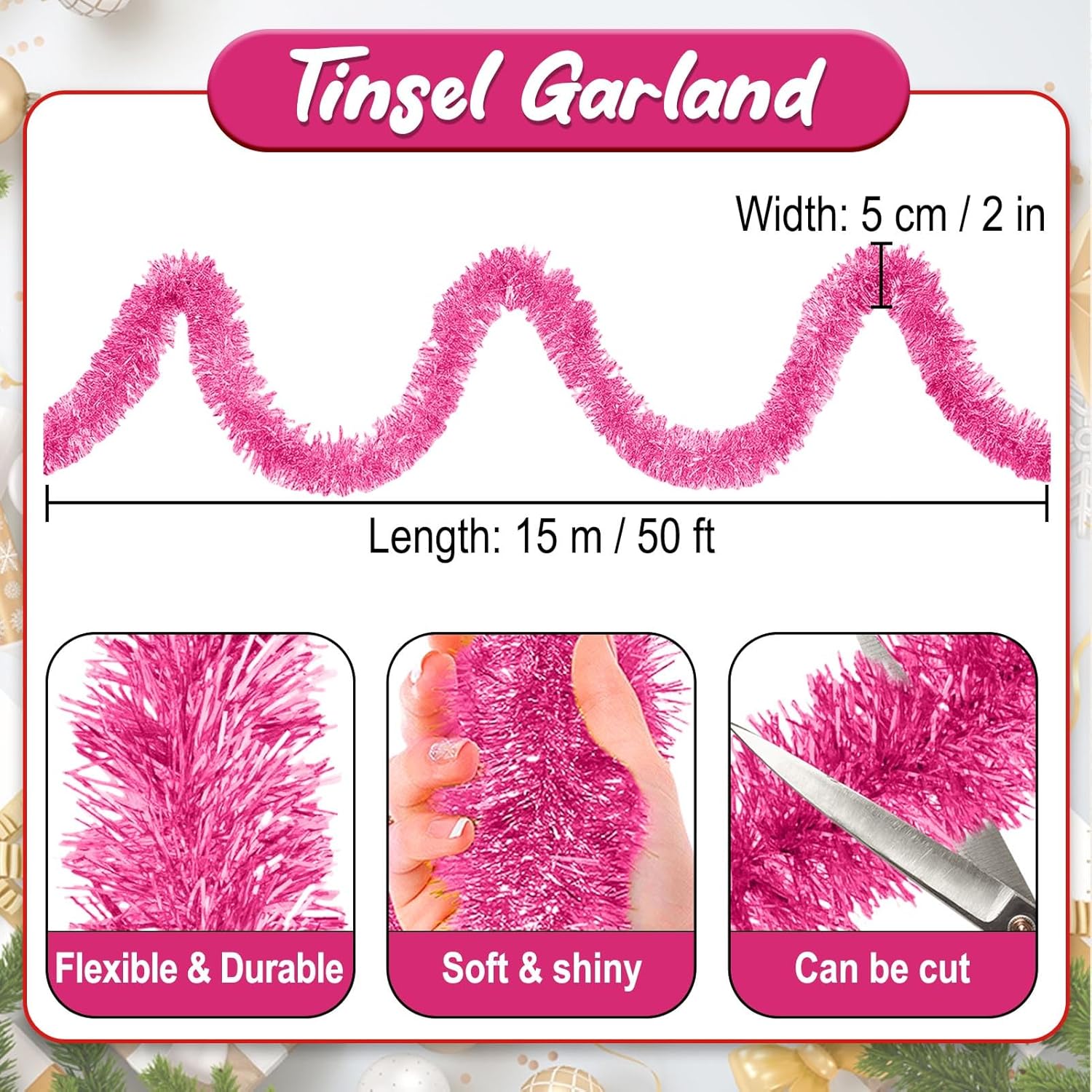 - Package and Size: Package comes with 1 piece Christmas tinsel garland, approx 15m/ 50 feet in length and 2 inches in width, which is long enough for your decoration needs. The abundant length is convenient for you to cut them in most length you want, to decorate your Christmas tree in your own style