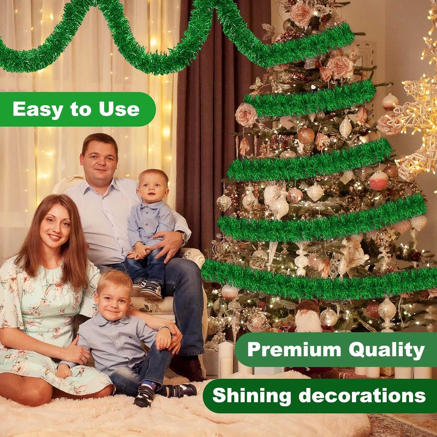 - Easy to Use: You can just hang the tinsel garland ornament on the christmas trees, not need many tools, and if you want to decorate them on the walls or stairs, you can use glue to stick them up, also use scissors to cut to the right length, twist them into various shapes as you like, then hang on to make your home full of joyful feelings