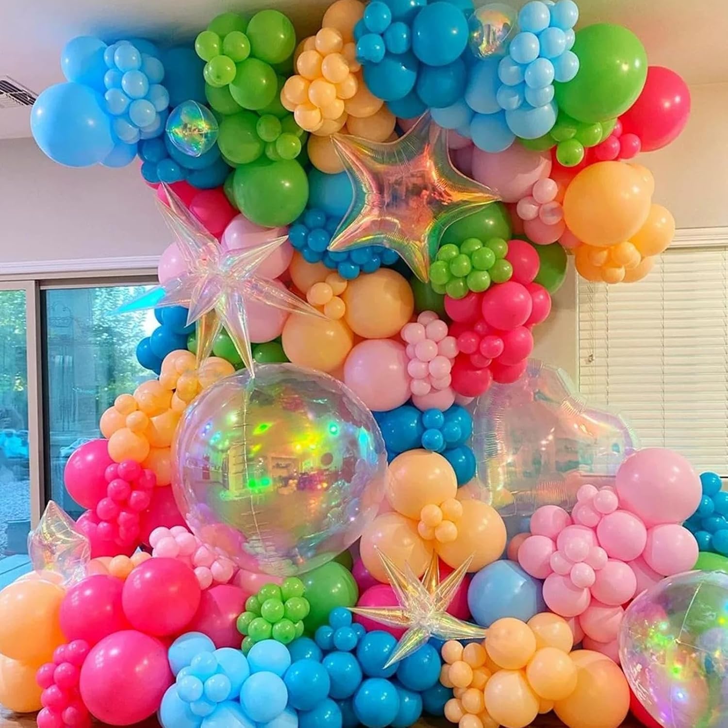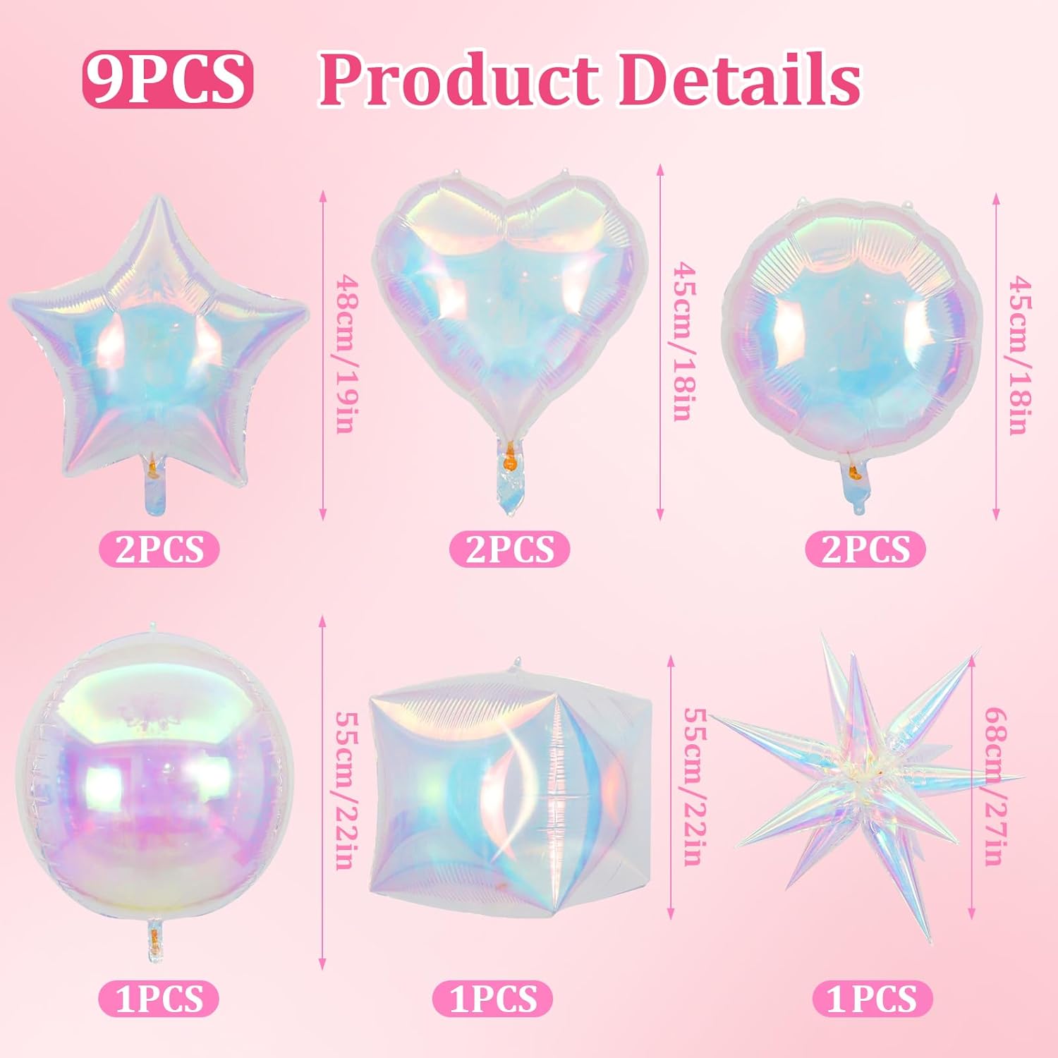 - Vibrant Decorations: Elevate your party with this set of 9 iridescent balloons in star, heart, starburst, laser 4D cube, and clear foil designs, ranging from 18-27 inches, 12pcs 48cm droplet shaped balloons (combined into 68cm explosion star balloons)