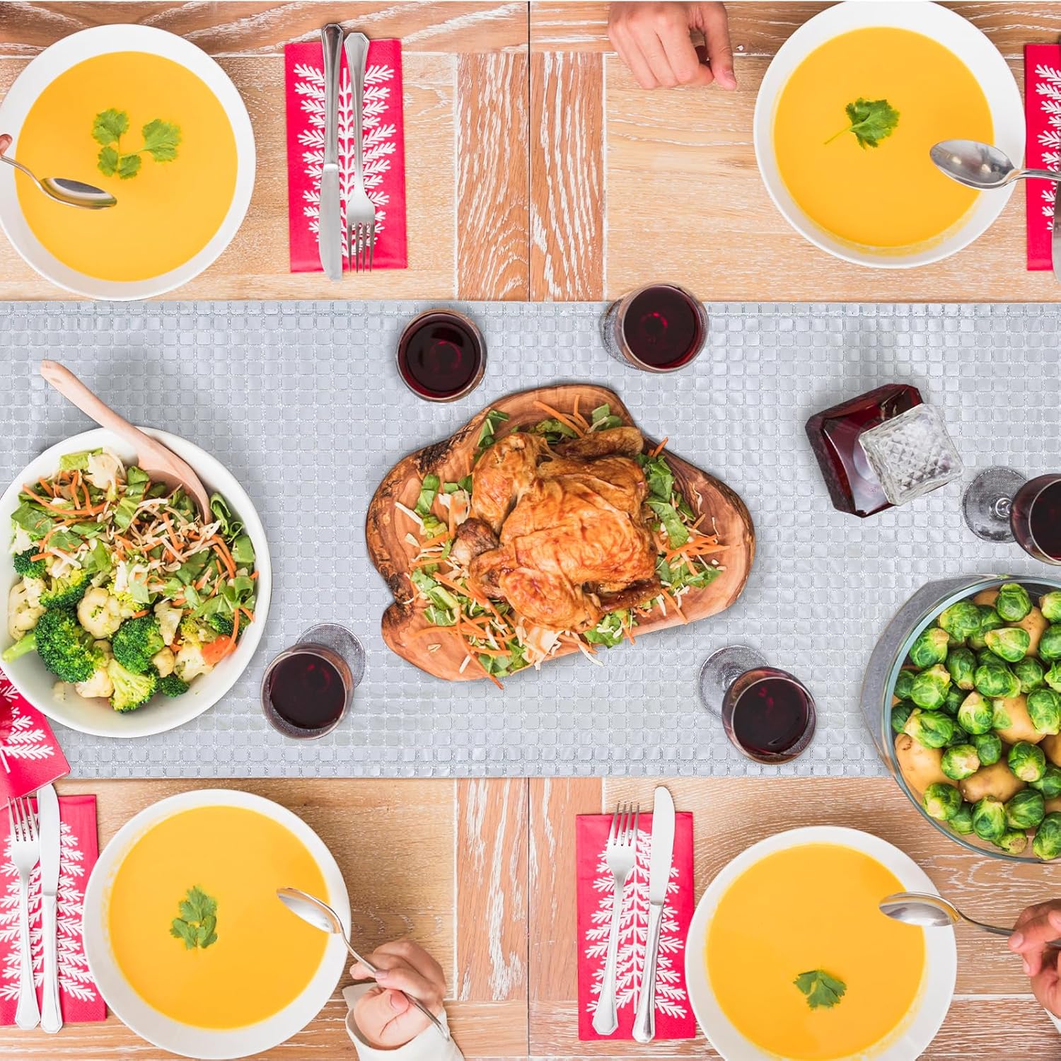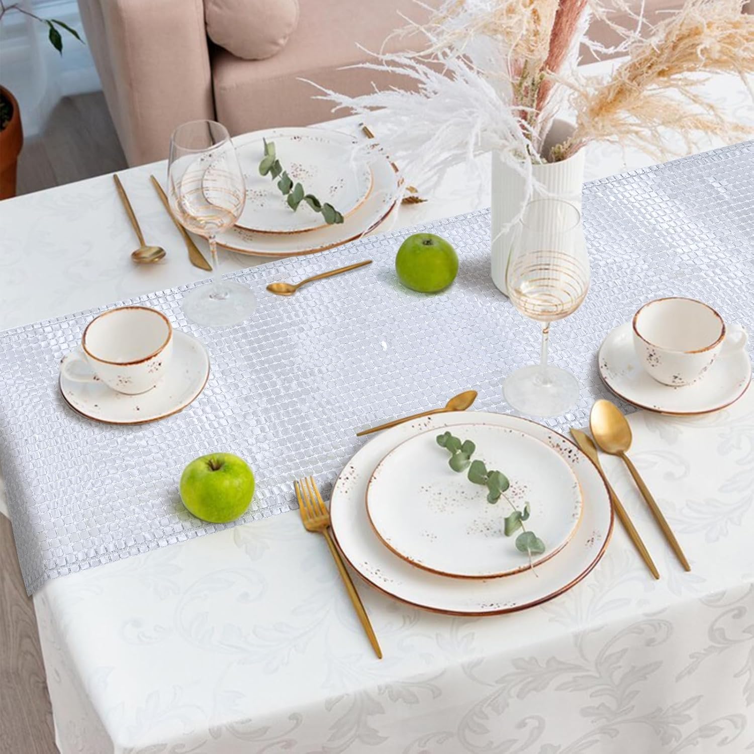 - MATERIAL: Our table runner features dazzling square foils on shimmering tinsel fabric, which is waterproof, oil-proof, stain-resistant, not easy to fade and long-lasting durability. Not only beautiful in appearance, but also practical.