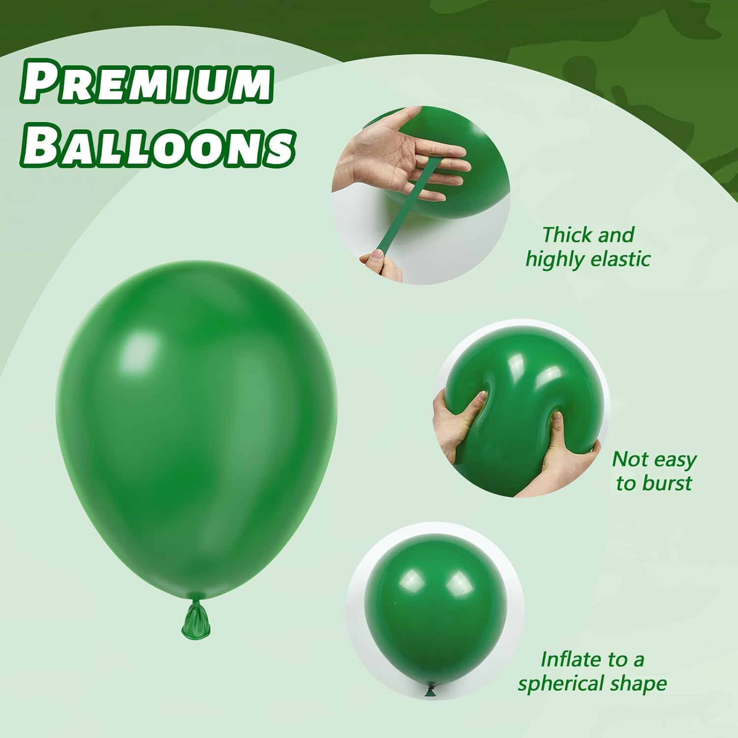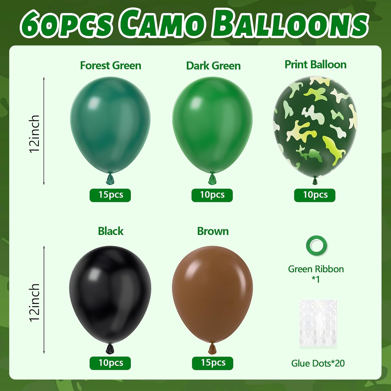 - Package Include: The camo balloons include 12inch forest green balloonsx15, 12inch dark green balloonsx10, 12inch brown balloonsx15, 12inch black balloonsx10, 12inch print balloonsx10, glue dotsx20, green ribbonx1