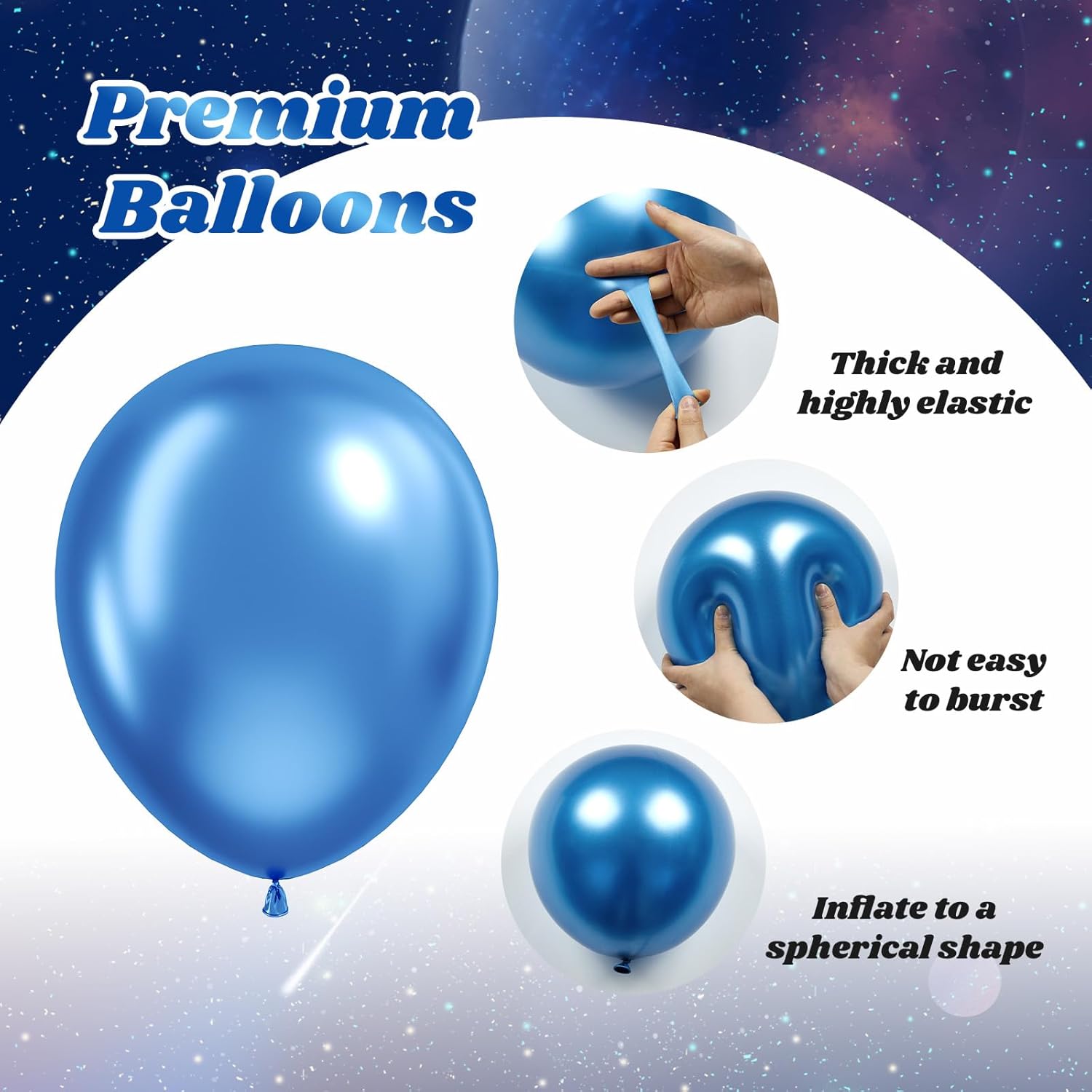 - Package Include: The outer space balloons include 12inch black balloonsx10, 12inch metallic navy blue balloonsx10, 12inch metallic blue balloonsx10, 12inch metallic purple balloonsx10, 12inch metallic light purple balloonsx10, 12inch metallic silver balloonsx10, glue dotsx20, black ribbonx1
