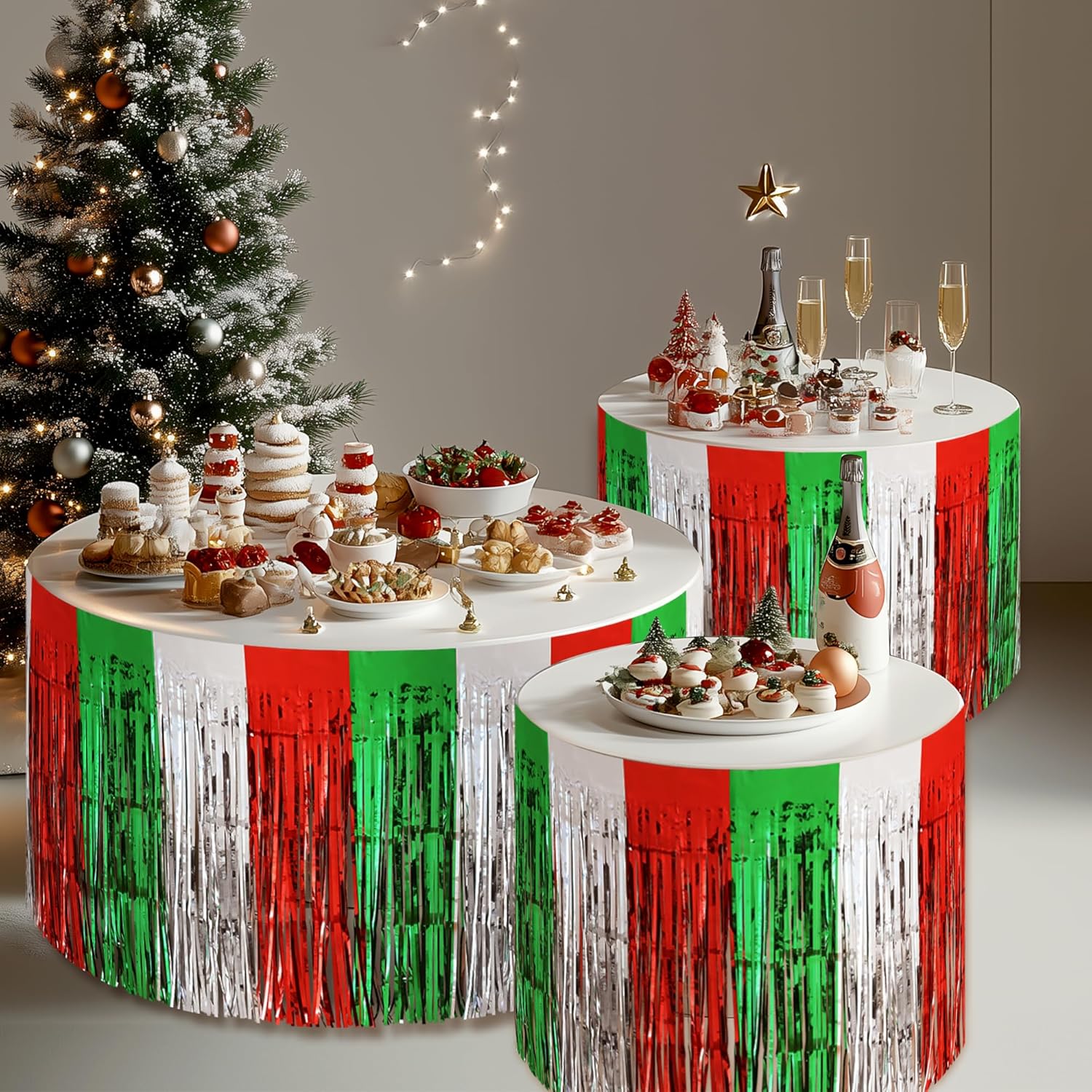 2 Pack Christmas Table Skirts, 29x108" Red & Silver & Green Metallic Foil Tinsel Fringe Table Skirts for Rectangle Tables Streamer Curtain Backdrop, Party Decoration for Xmas Birthday Wedding Holiday