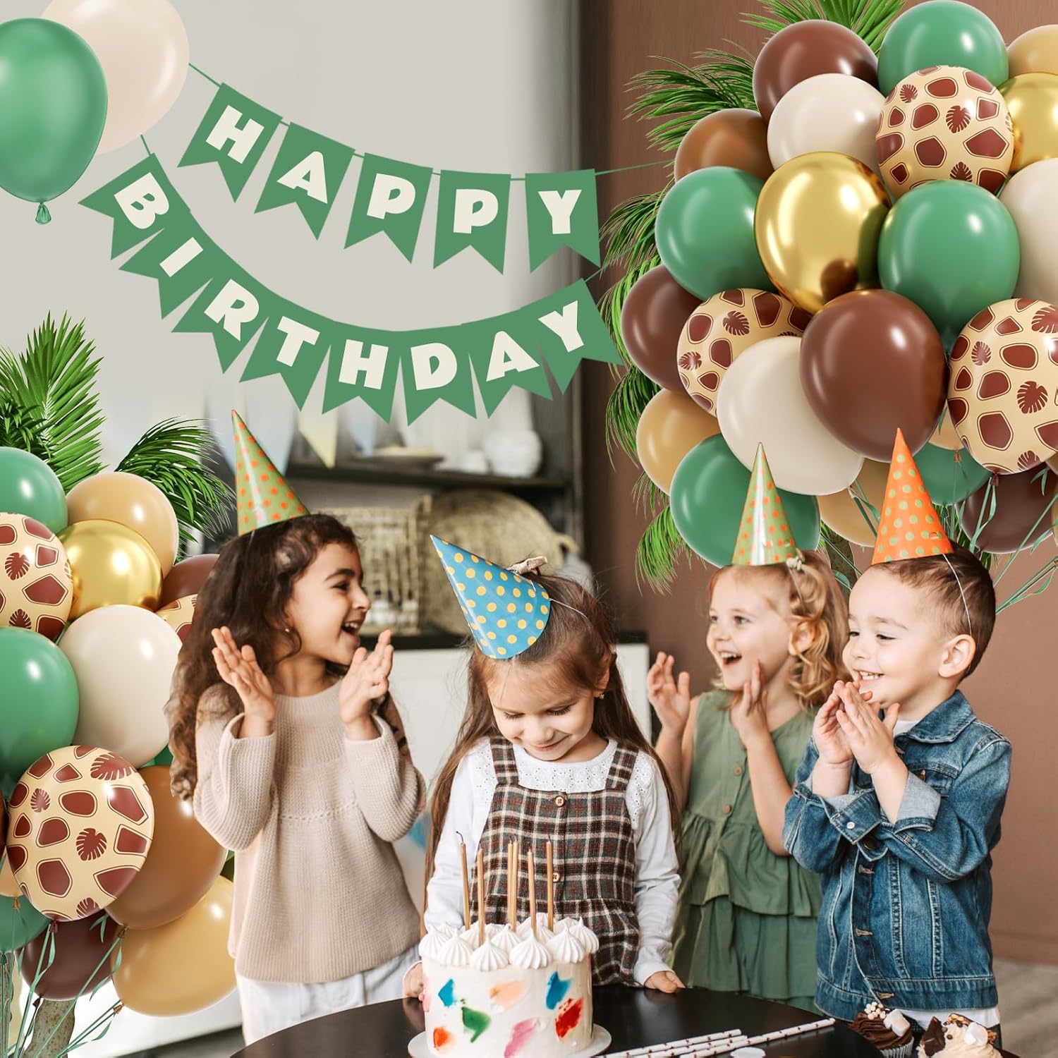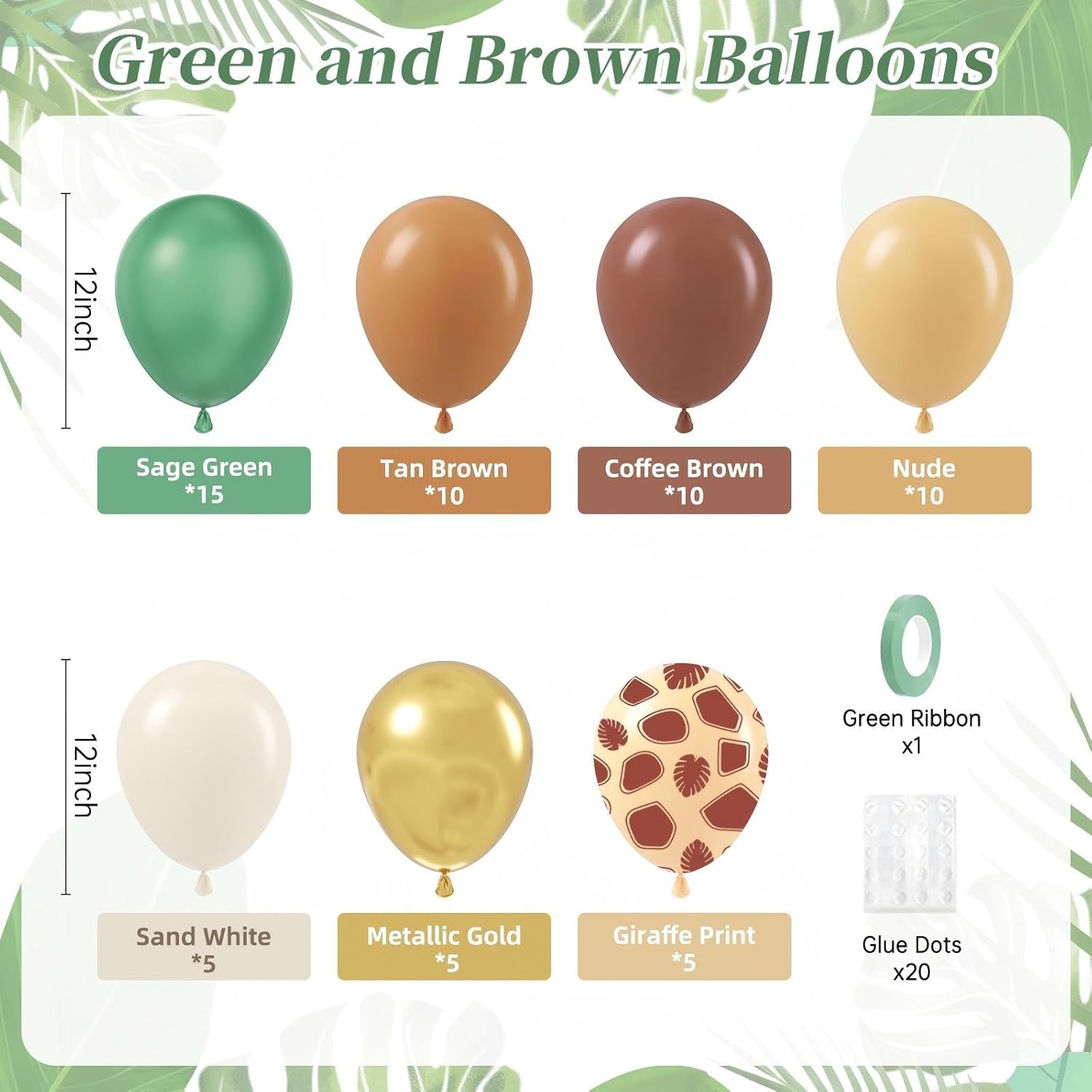 - Package Include: The jungle balloons include sage green balloonsx15, coffee brown balloonsx10, light brown ballonsx10, nude balloonsx10, sand white balloonsx5, metallic gold balloonsx5, giraffe print balloonsx5, glue dotsx20, green ribbonx1, decorative stripx1