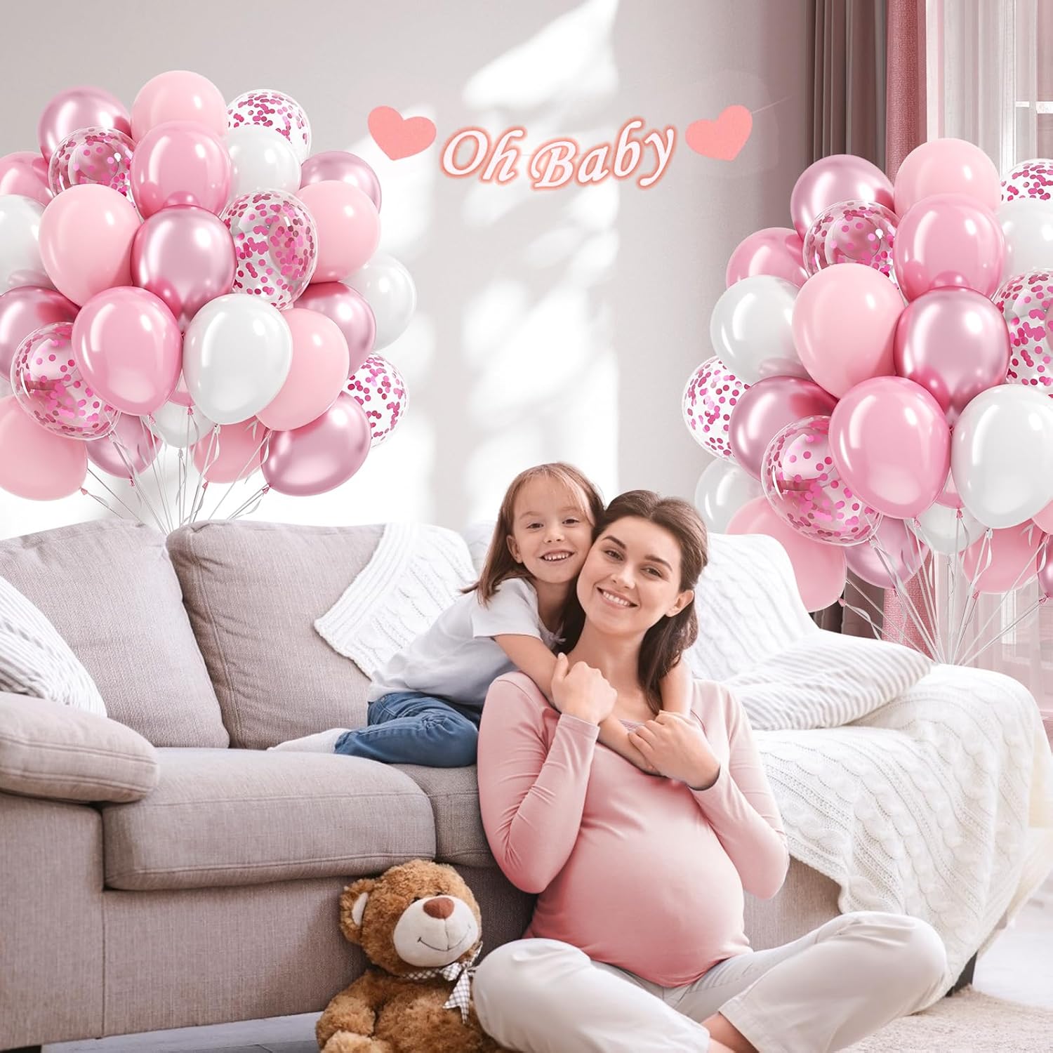- Package Include: 12inch light pink balloons x15, 12inch pearl pink balloons x10, 12inch pearl white balloons x15, 12inch pink confetti balloons x10, 10inch metallic light pink balloons x10, ribbon x1, glue dot x20