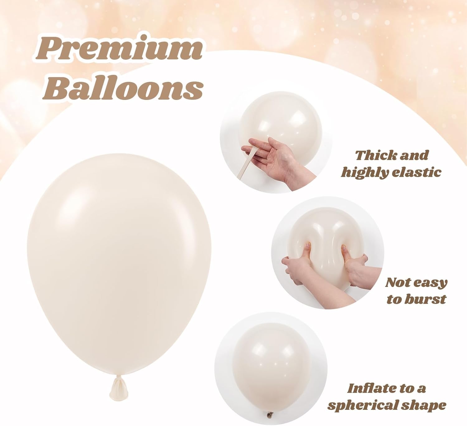 - Package Include: The beige balloons include 12inch white balloonsx15, 12inch clear balloonsx15, 12inch sand white balloonsx10, 12inch ivory cream beige balloonsx10, 12inch metallic champagne gold balloonsx10, glue dotx20, ribbonx1, decorative stripx1