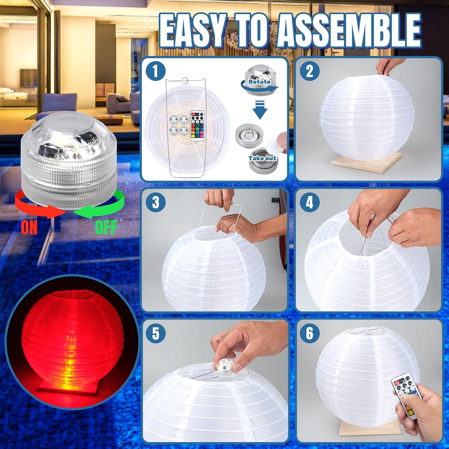 - Effortless to Use: Using these pool led lights is a breeze.Simply place the iron frame accessories to prop up the lantern.Remove the insulation to turn on the LED light and use the remote control to select your desired lighting effect.These floating lanterns for pool are not only highly functional but also incredibly aesthetically pleasing.Enjoy their beauty pool decorations outdoor and enchanting atmosphere.