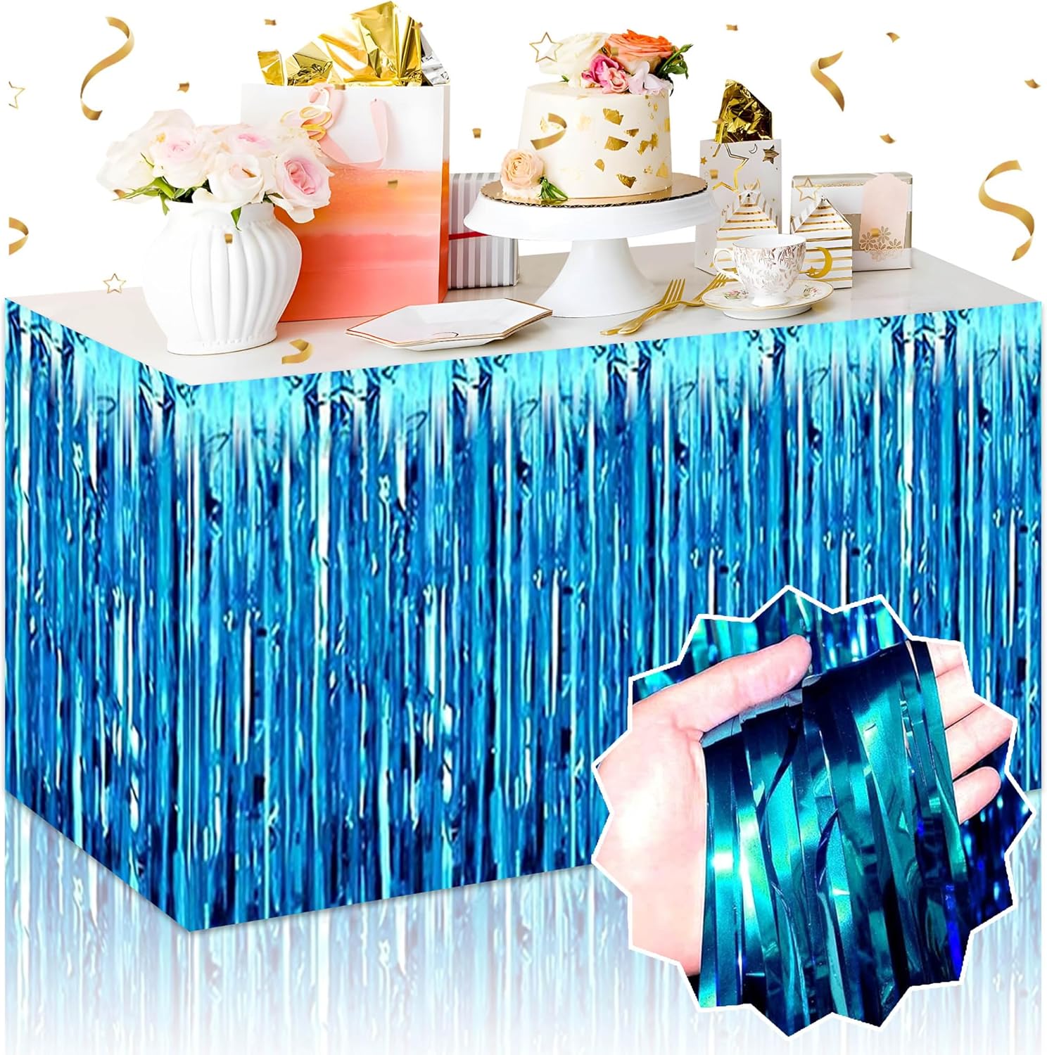 3 Pack 29 x108 Inch Lake Blue Foil Fringe Table Skirts Metallic Banner for Tinsel Streamer Garland Backdrop for Parade Floats Mother's Day, Graduate, Birthday, Wedding Party Decoration