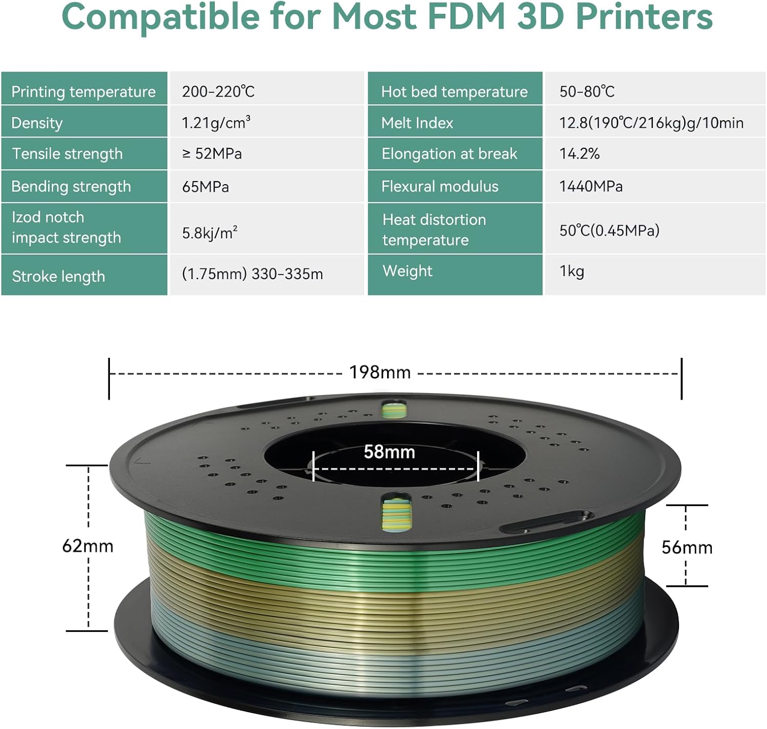 - 【Silk PLA Rainbow】3D Printer Filament has a unique silky texture, the surface of the print is smooth and shiny, PLA Filament 1.75mm let your prints have different colors on every sides. Four colors per inch.