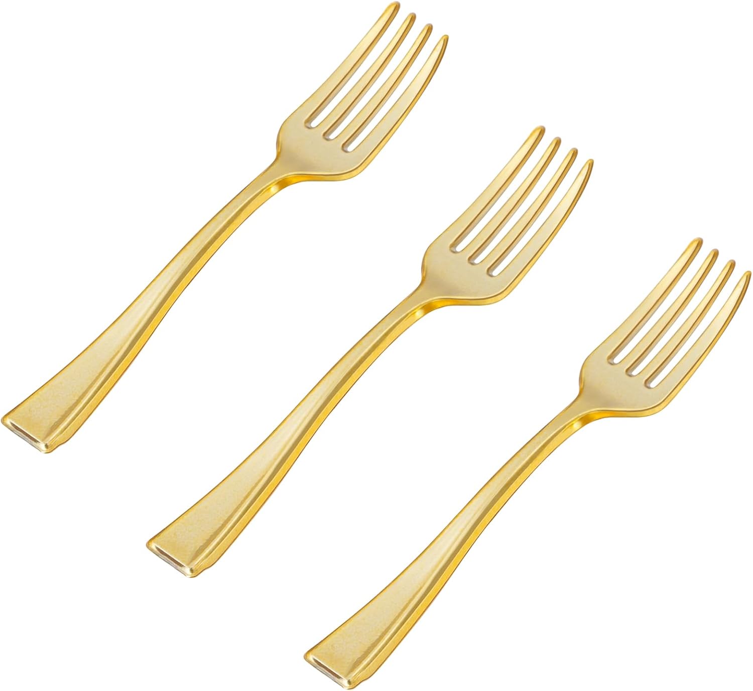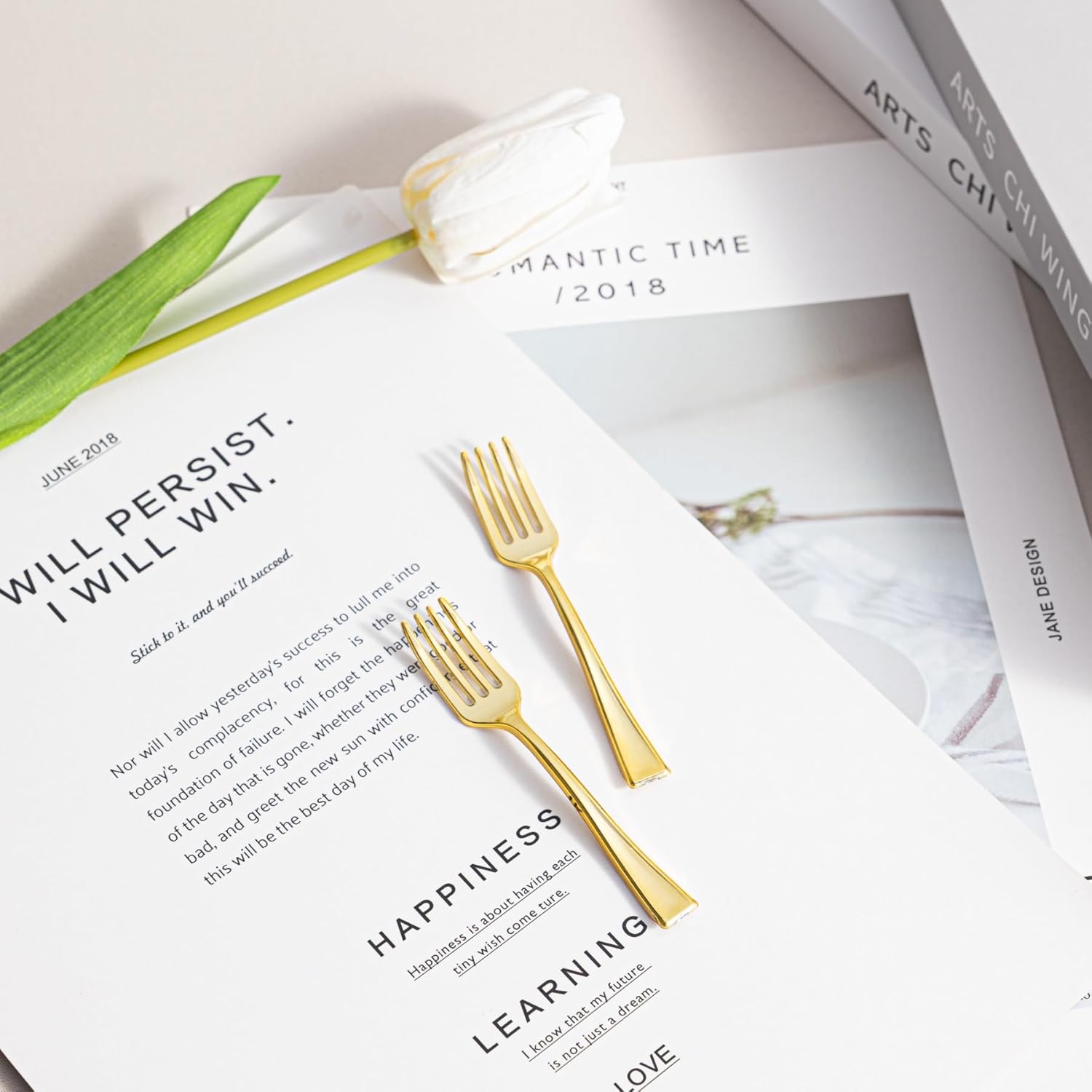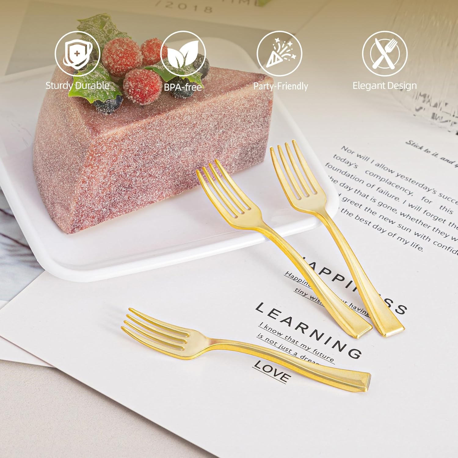 N9R 200PCS Gold Plastic Mini Forks, 4 Inches – Heavy Duty Disposable Cocktail, Dessert & Appetizer Forks, Elegant Party Serving Utensils for Tastings, Finger Foods, Weddings, Events