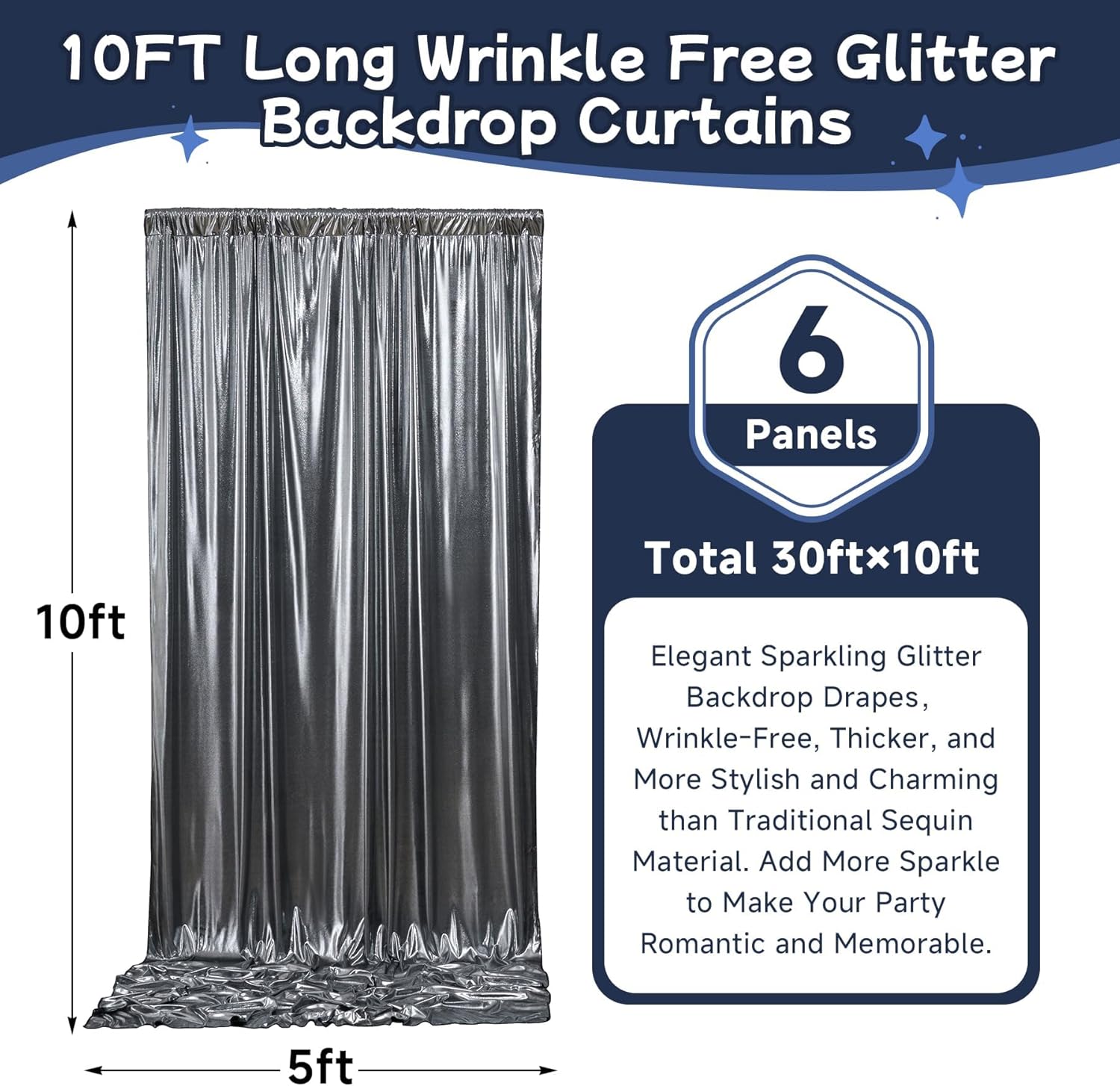 30ftx10ft Black Silver Glitter Sequin Backdrop Curtain for Parties, Wrinkle Free Sparking Backdrop Drapes, 6 Panels 5x10ft Shimmer Photo Back Drop Cloth for Wedding Birthday Photography