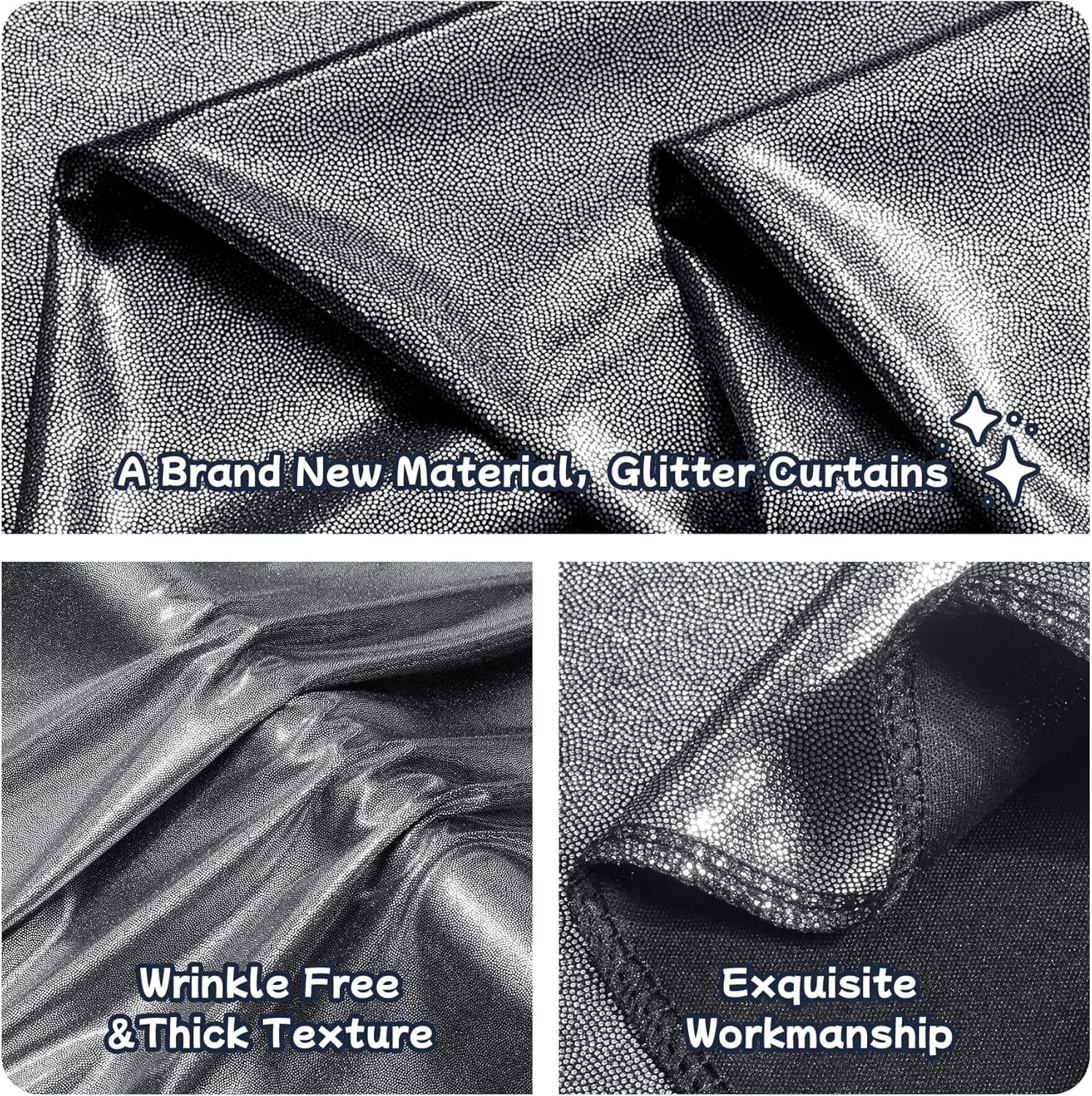 - Easy to Care Black Silver Shimmer Curtains Our 10ft Black Silver sequin glitter party background curtain panels are made of wrinkle-free material, which could be used without ironing. Let you make unforgettable memories for your family or your friends.