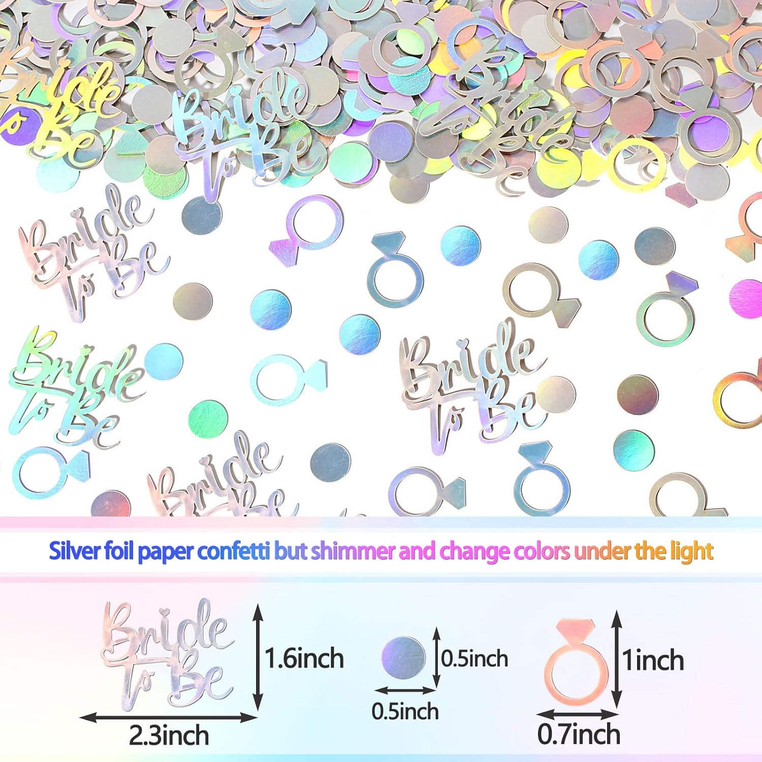 - Proper size and Great material.The ring bachelorette table scatters size is 1inch,the circle dot inside the ring is 0.5inch,bride to be letter 2.3*1.6inch.Material is shimmering silver foil paper cardstock,fitting well for iridescent party decor.