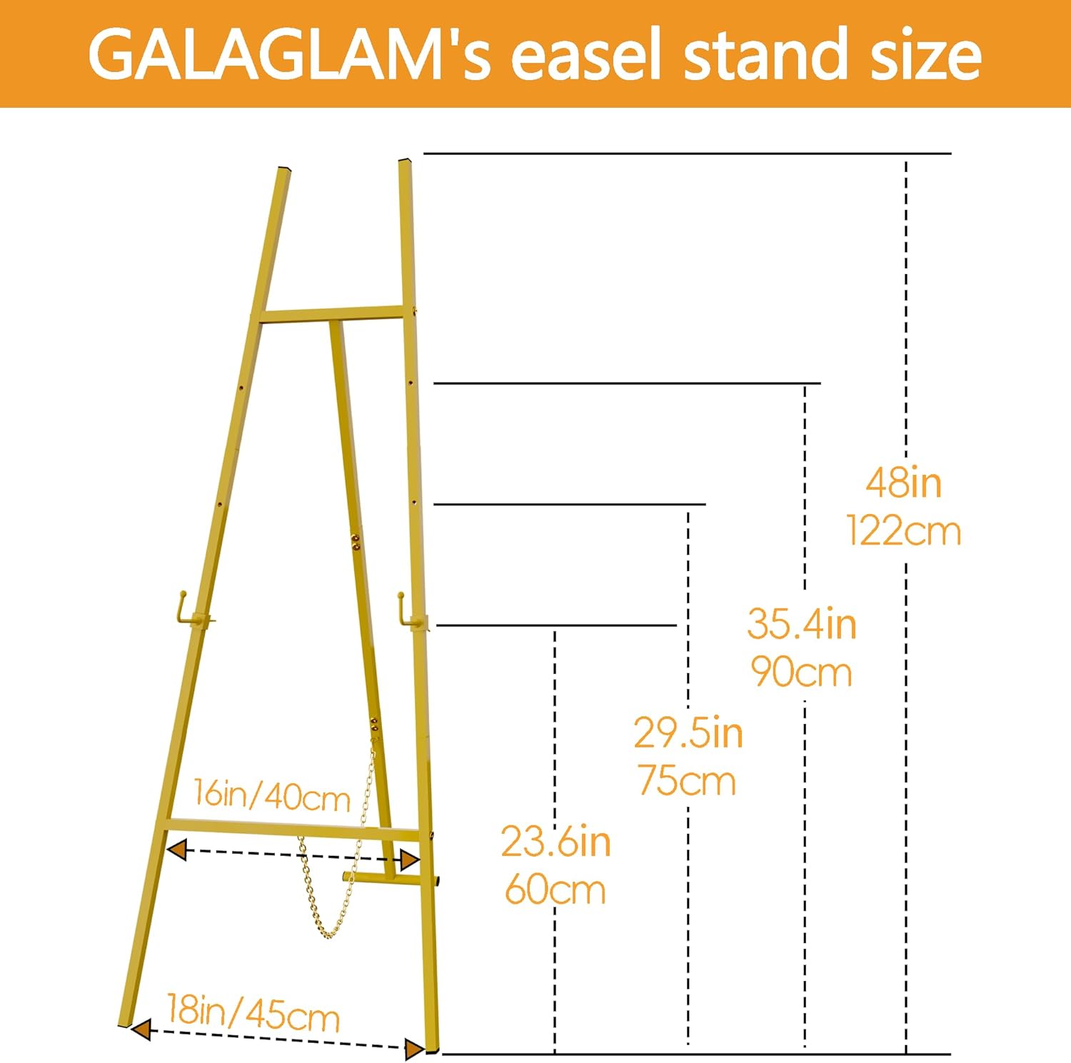 - LARGE EASEL STAND FOR DISPLAY β GALAGLAM's easel stand measures 19L x 18W x 48H inches and weighs 4.9 lbs