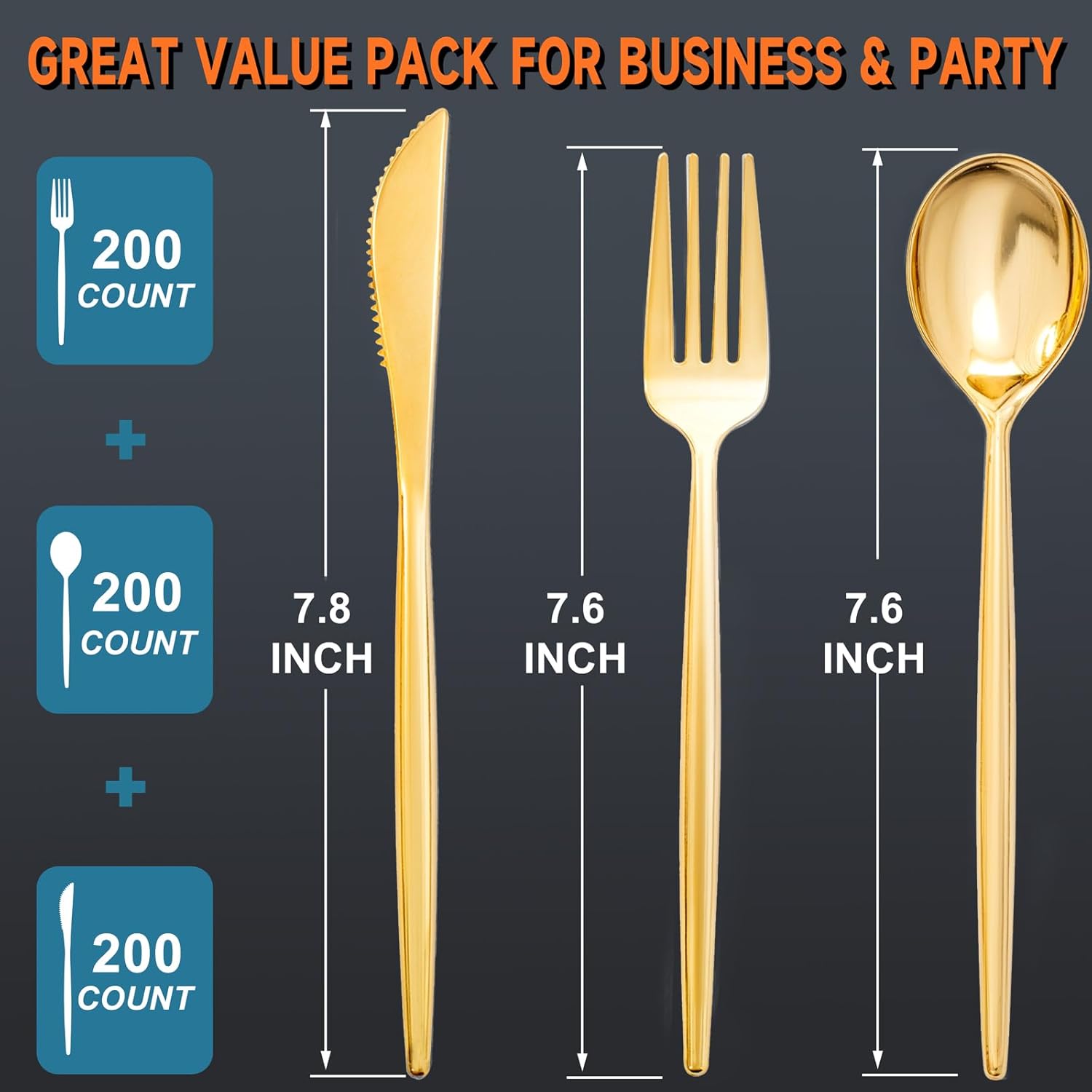 - COMPREHENSIVE SILVERWARE SET: This extensive package includes 600 pieces of plastic silverware, featuring 200 gold plastic forks, disposable spoons, and knives.Ideal for large gatherings, our spoons and forks set ensures every guest has stylish and functional utensils, eliminating worries about running out during your special occasion.