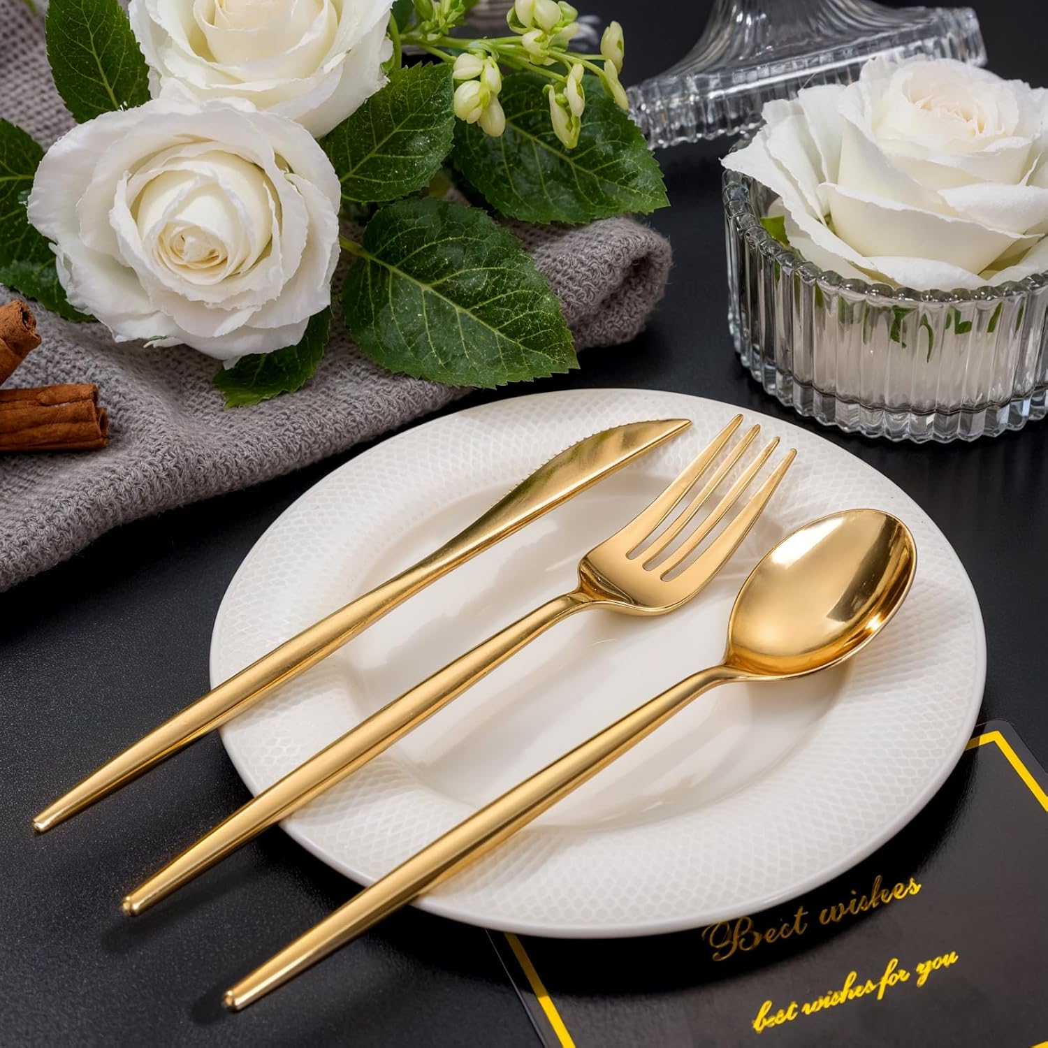 - CONVENIENT DISPOSABLE SOLUTION: Enjoy the hassle-free aspect of our disposable silverware!After your event, simply discard the utensils without the stress of washing up. This makes our gold utensils set an excellent option for busy households, catering services, and outdoor picnics where quick cleanup is essential.