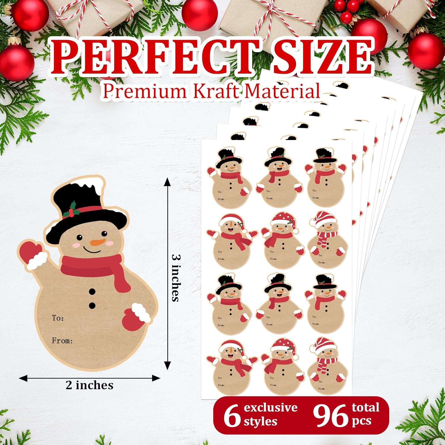 Christmas Gift Tags Stickers, 96Pcs Christmas Gift Labels Stickers, Self-Adhesive Christmas Name Tags for Xmas Gifts Wrap Presents Boxes Decoration, 2 x 3 Inch, Natural Kraft Paper Snowman Stickers