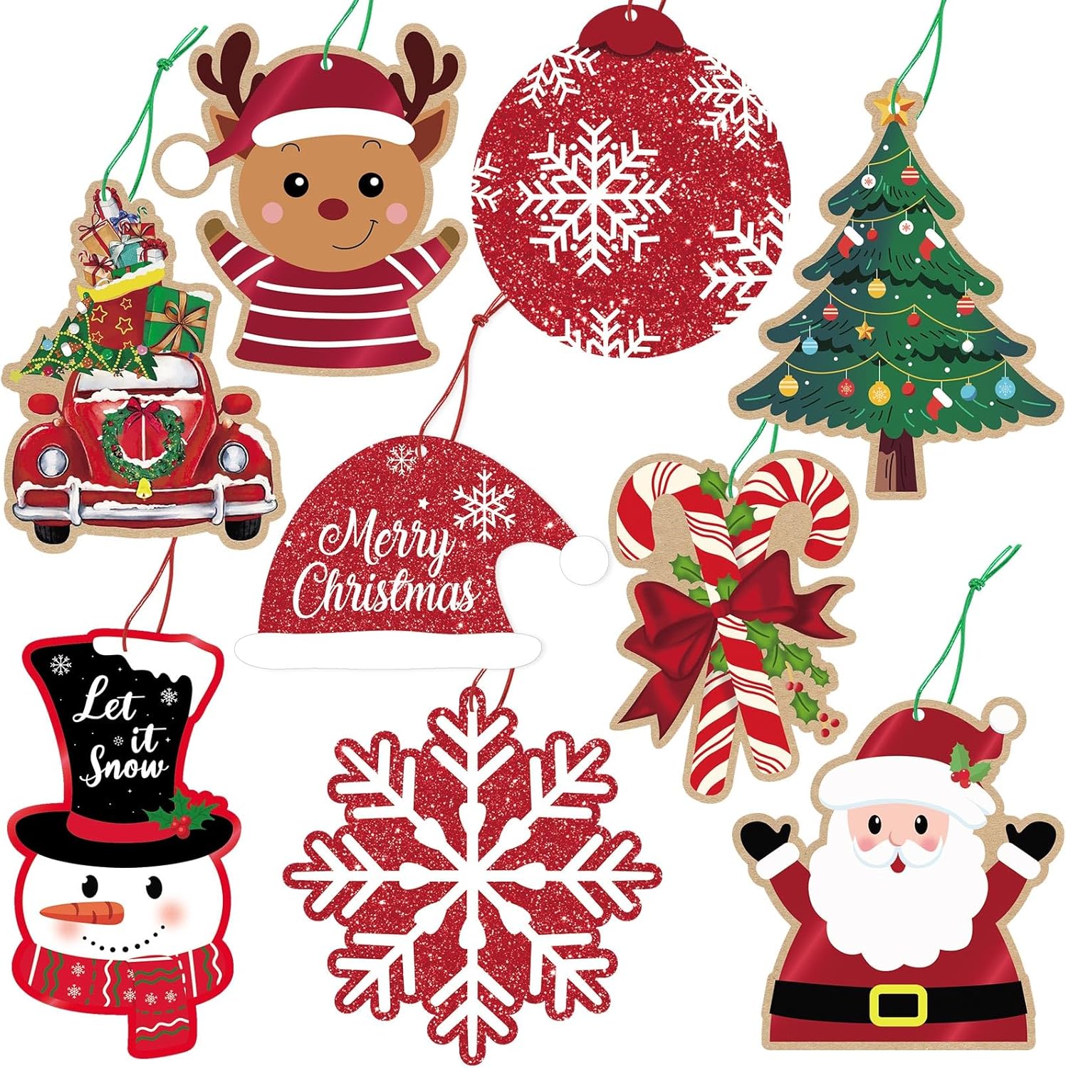 - 【Xmas Gift Tags Assortment】You will get 63 pieces of Christmas Gift Tag with "To" and "From" printed on back, 1 bundle of 19.7-foot of green string, and 1 bundle of 23-foot of red string. Christmas labels for gifts has 9 exclusive designs, 7 pieces each. Various styles and sufficient quantity, meet your decorating needs.