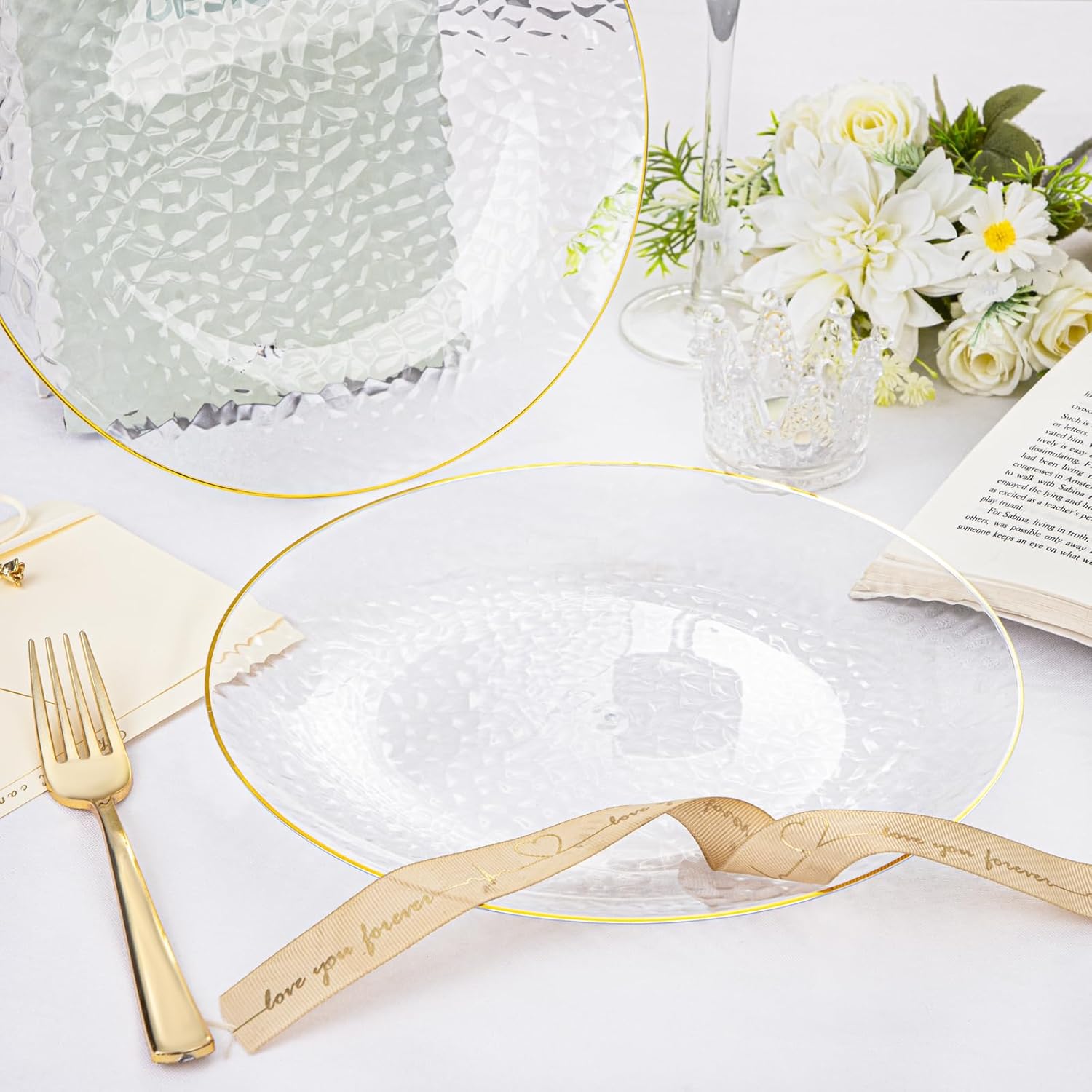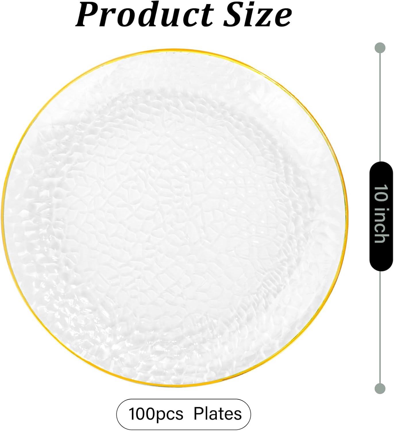 - Hammer Pattern Unique Design:Elevate your dining experience with our 10-inch gold and clear plastic plates, featuring a stunning hammered design that adds a glass-like elegance to any occasion.