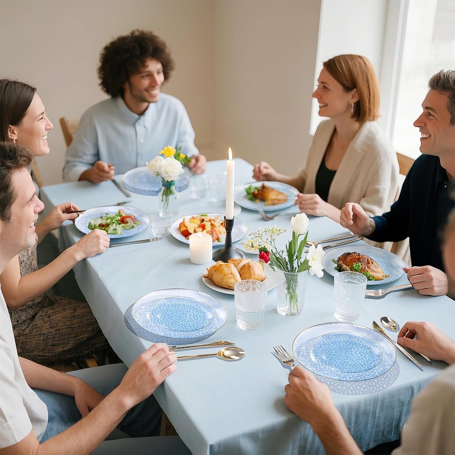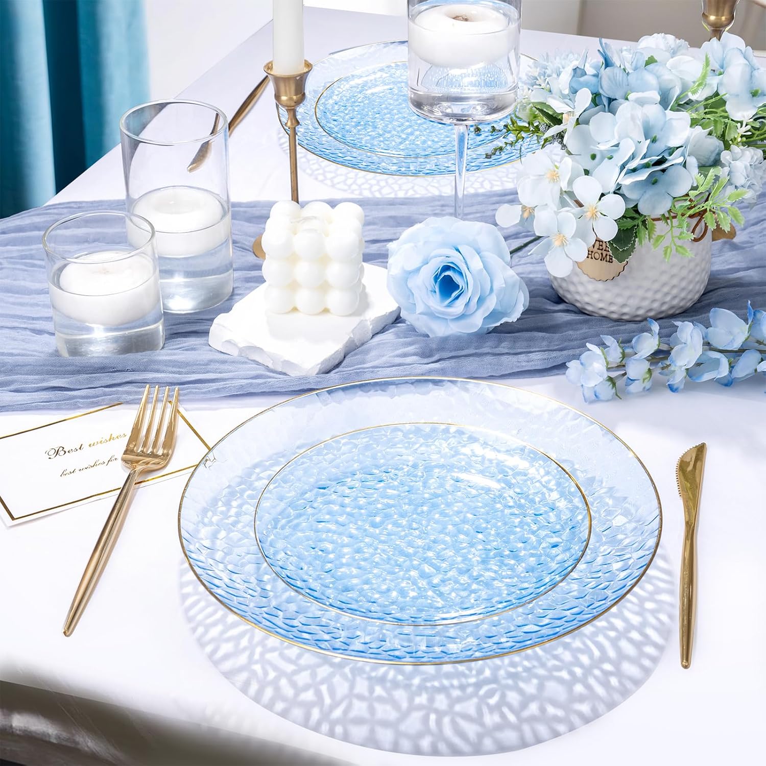 - Elegant Design: Elevate your dining experience with our 10-inch clear blue plastic plates featuring a stunning gold rim. The hammered texture adds a touch of sophistication, making these blue plastic plates the perfect choice for any occasion.