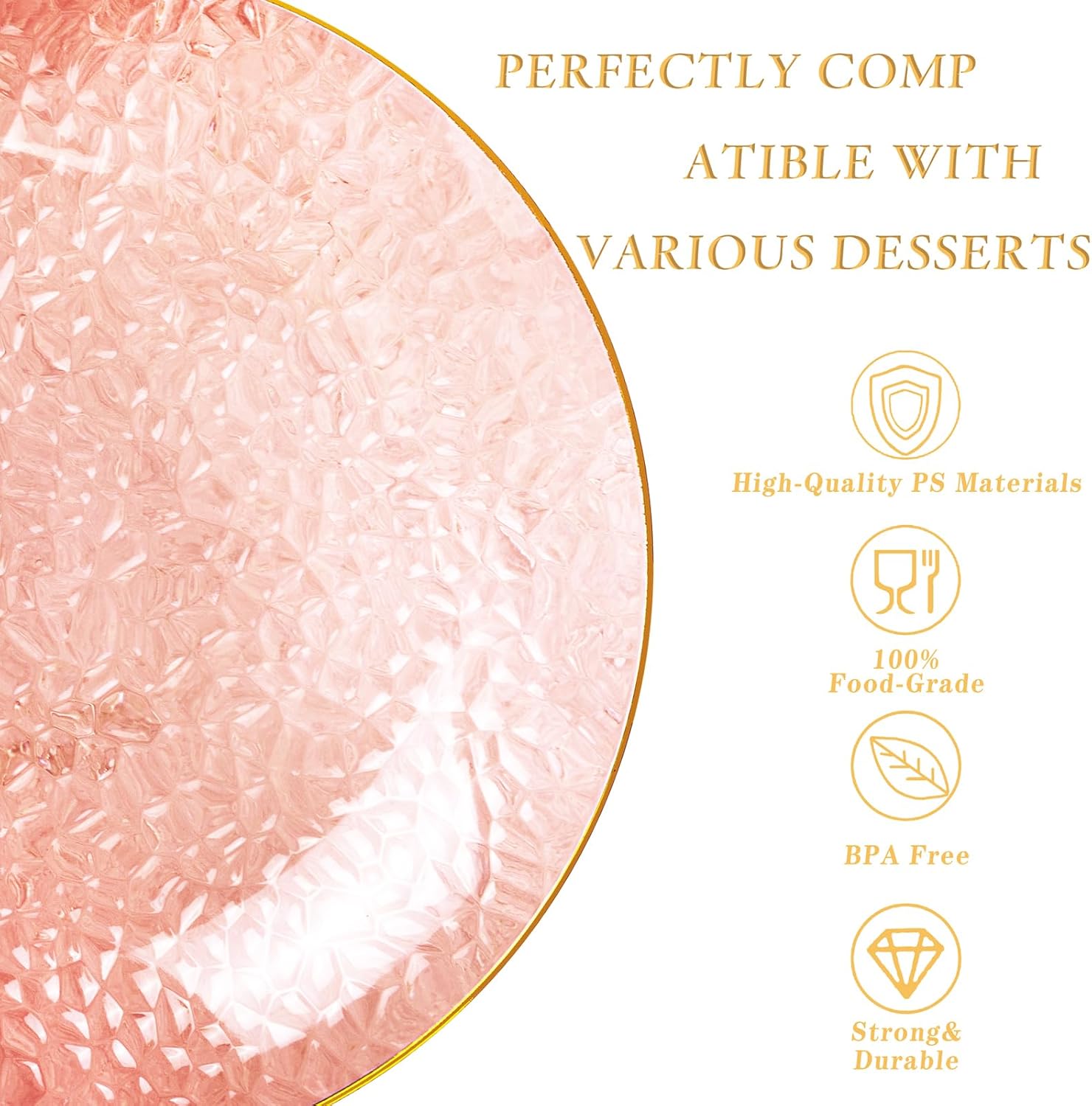 Rubtlamp 60 Pieces Pink Gold Plastic Plates - 10 inch Pink Plastic Dinner Plates - Hammer Pattern Design - Fancy Clear and Gold Disposable Plates Ideal for Mother's Day