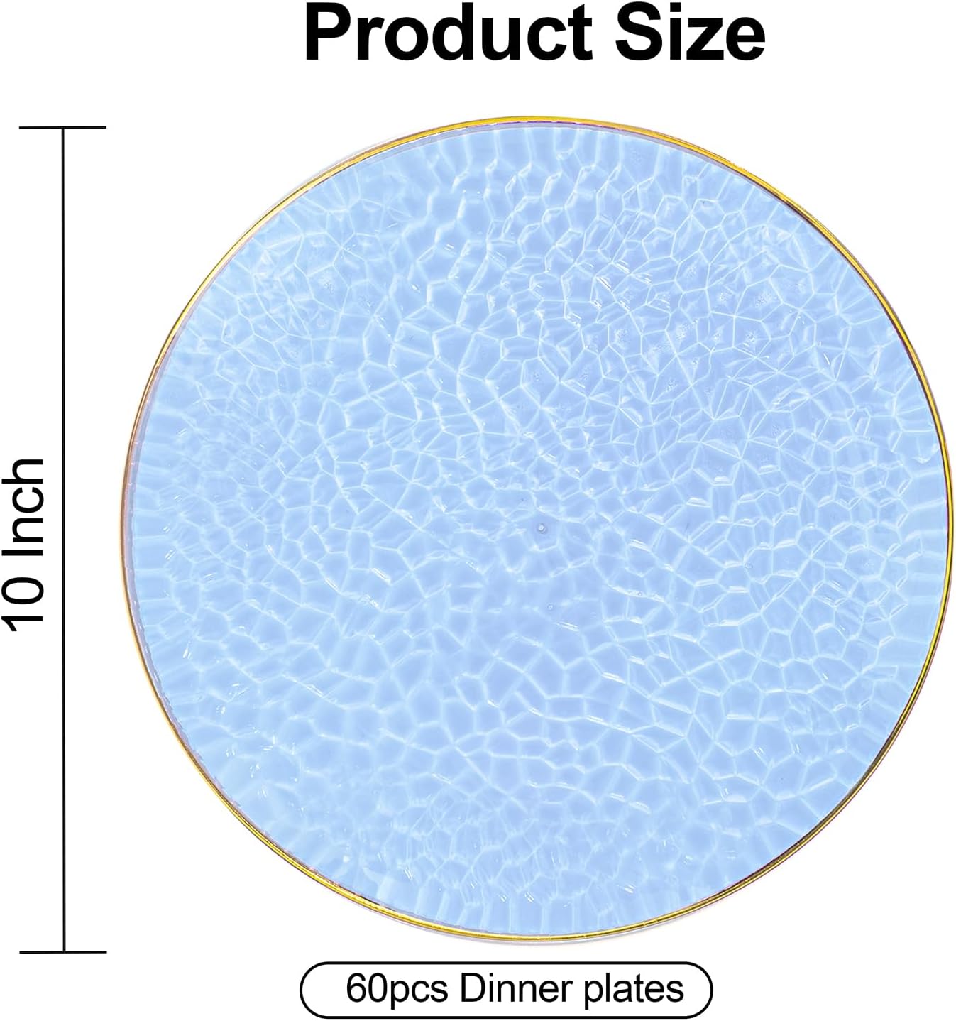 Rubtlamp 60 Pieces Blue Gold Plastic Plates - 10 inch Blue Plastic Dinner Plates - Hammer Pattern Design - Fancy Clear and Gold Disposable Plates Ideal for Wedding & Party