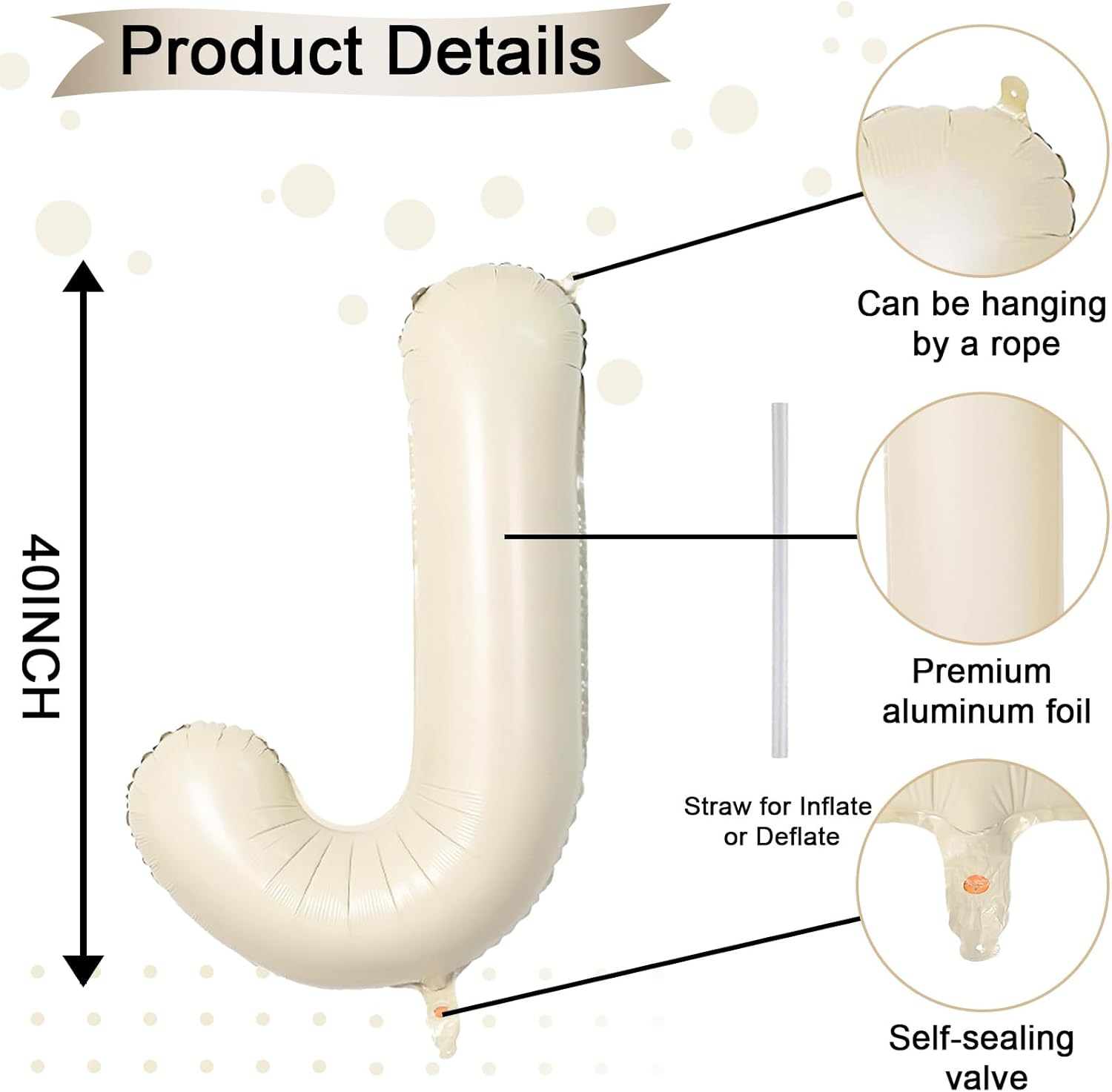 - Cream White Letter J Balloon 40 Inch: Includes 1pc giant beige "J" letter balloon and 1 straw for easy inflation and deflation. Our elegant big beige balloons are perfect for personalized parties. With 26 letters (A-Z) and numbers (1-9) available, you can mix and match to fit your theme.