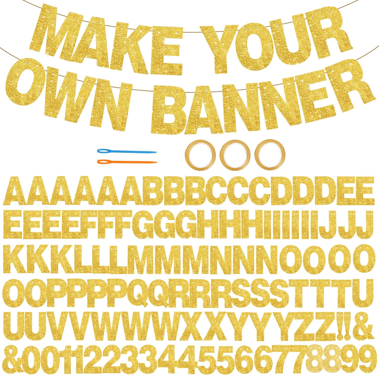 BEISHIDA 116 PCS A-Z Glitter Gold DIY Letter Banner Kit Make Your Own Banner,Including 111 Letters and Numbers 3 Rope and 2 Threading Device,Customized for Birthday Graduation Wedding Party Decor