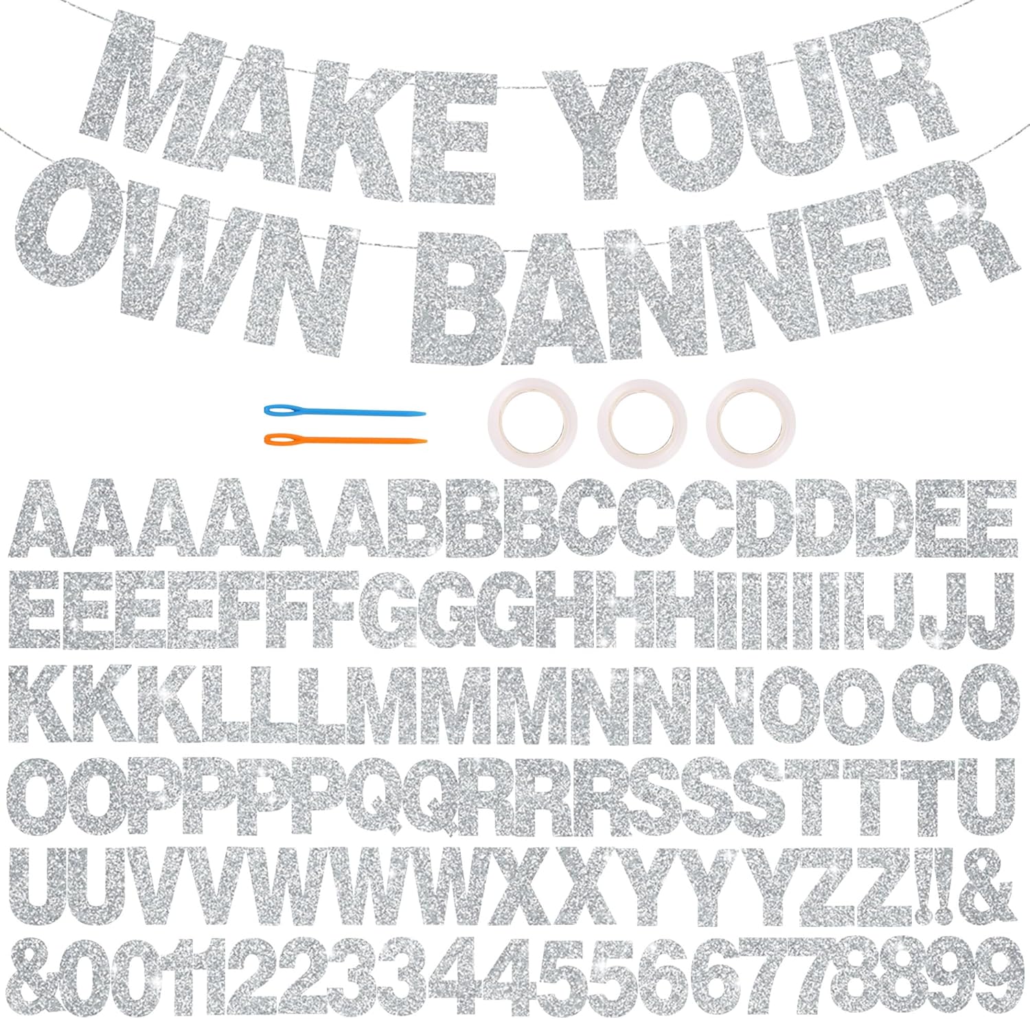 BEISHIDA 116 PCS A-Z Glitter Silver DIY Letter Banner Kit Make Your Own Banner,Including 111 Letters and Numbers 3 Rope and 2 Threading Device,Customized for Birthday Graduation Wedding Party Decor