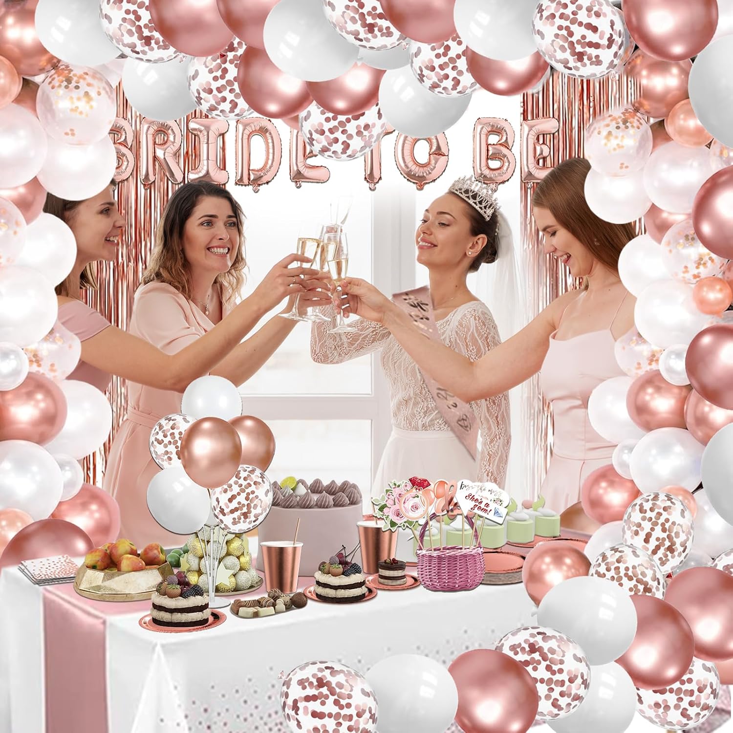 - [Rich rose gold Themd Party Decor] - Our Kit contains 30 x latex balloons in different colors, 1 x tiara, 1 x sash, 1 x veil, 1 x “BRIDE TO BE” foil balloon, 2 x rain curtains, 1 x Ribbon, 1 x balloon strip, will decorate a memorable bachelorette party for you!