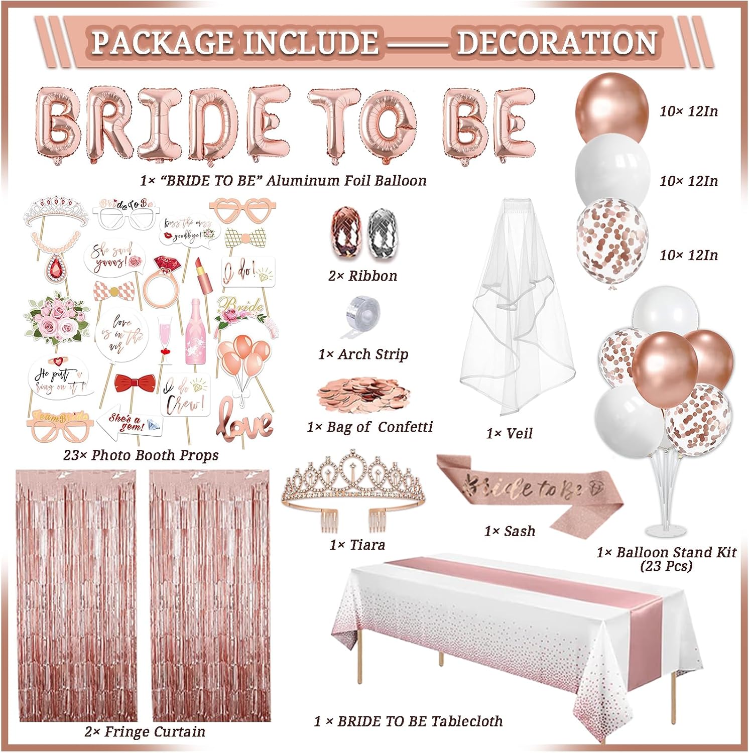 - Included Components : 1 x "BRIDE TO BE" foil balloons, 1 x tiara, 1 x sash, 1 x Veil, 2 x Fringe Curtains, 1 x rose gold table runner, 1 x Balloon Stand Kit, 23 x rose gold Theme Photo Props, Rose Gold Theme Disposable Dinnerware Set For 25 Guests (25 x 9" plates, 25 x 7" plates, 25 x 9 oz cups, 25 x Napkins, 25 x straws, 25 x knives, 25 x forks, 25 x spoons), 1 x rose gold Tablecloth, 1 x variety of balloon party kits(33 Pcs) 1 x "BRIDE TO BE" foil balloons, 1 x tiara, 1 x sash, 1 x Veil, 2 x Fringe Curtains, 1 x rose gold… See more