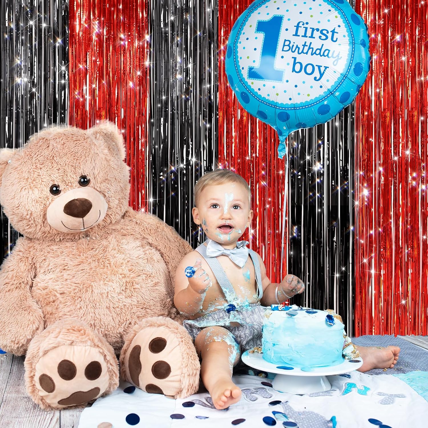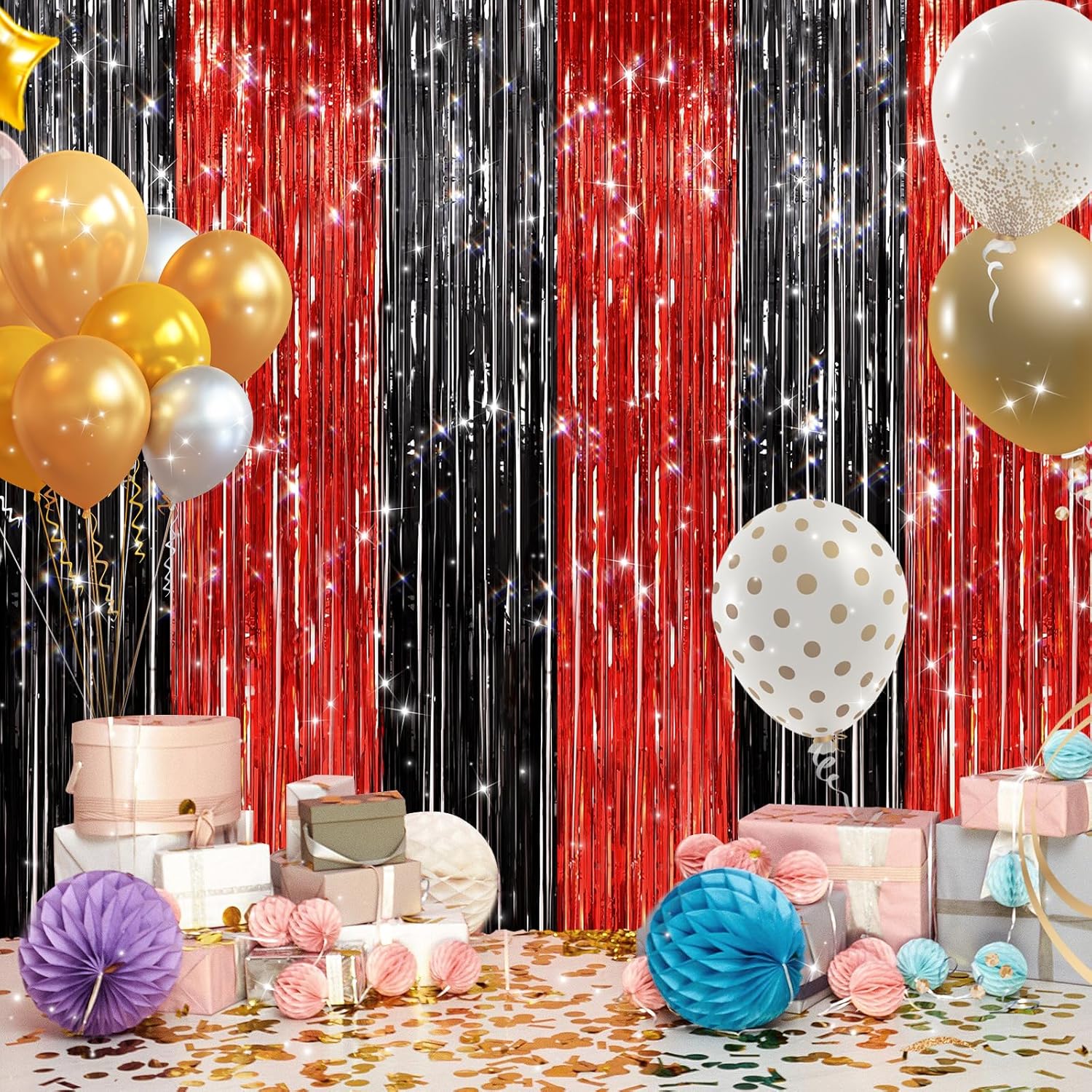- Foil Fringe Backdrop: Includes 2 packs shiny Black and Red foil fringe curtains, enough quantity for your party decoration. Each pack curtains size is 3.3 ft x 6.58 ft, enough length for decorate your party. Perfect accessories for decorating doors and walls. for creating a stunning backdrop for any occasion. shimmer tinsel backdrop curtain, you can make a beautiful entrance door curtain or a photo booth backdrop for your guests. They are perfect for christmas party.