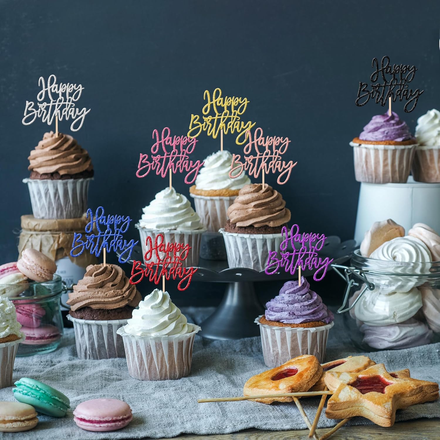- Wide Usages ! These happy birthday cupcake toppers are perfect for happy birthday theme party, anniversary celebrating theme party cupcake decorations. they can make your cupcake more attractive and bring the fun to your party.You can also apply them for ice cream, fruits, cookies and other desserts.