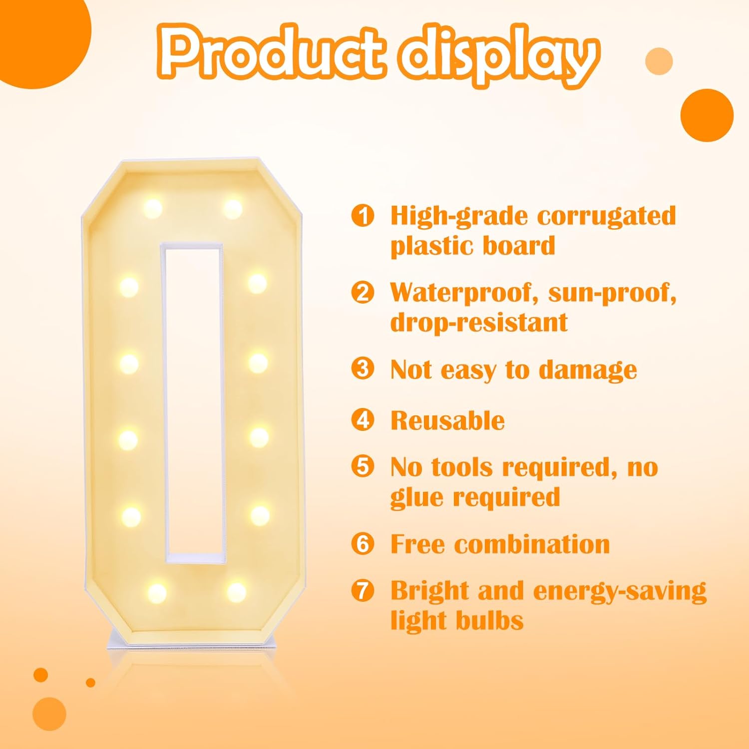 - Easy To Assemble Light Up Letters: Our unique 4ft marquee light up letters are not afraid of water and is not easily damaged. Pre-cut boards with clear markings help you set up your marquee light up letters with minimal effort, and quickly without any tool. The combination of letter balloons and fake flowers will make the decoration full of vitality, romance, and joy, adding a sense of celebration to the party. Letter O