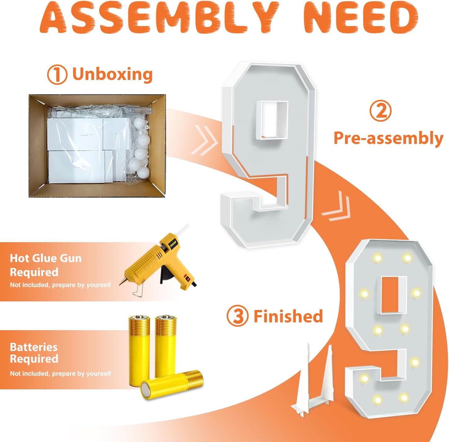 - EASY TO ASSEMBLE: The package includes pre-cut foam boards, light strings and instructions. Each foam board has slots and is numbered, so you can match them according to the 2 same numbers. All you need to do is to prepare a hot glue gun and 3 AA batteries, follow the step-by-step instructions or online video for a hassle-free assembly. Decorate the party with your kids or friends and enjoy the DIY fun. (Note: Glue gun, glue and batteries are not included)