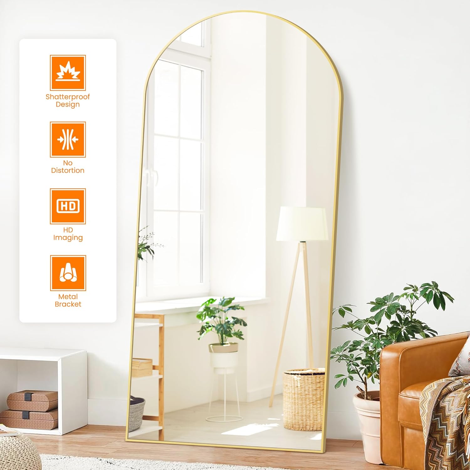 - Wall mirror has a classic arch shape with a shatterproof design. It can be hung on the wall or stand on the floor and is suitable for a variety of home styles such as modern classical boho. Product size is 75" x 35''.