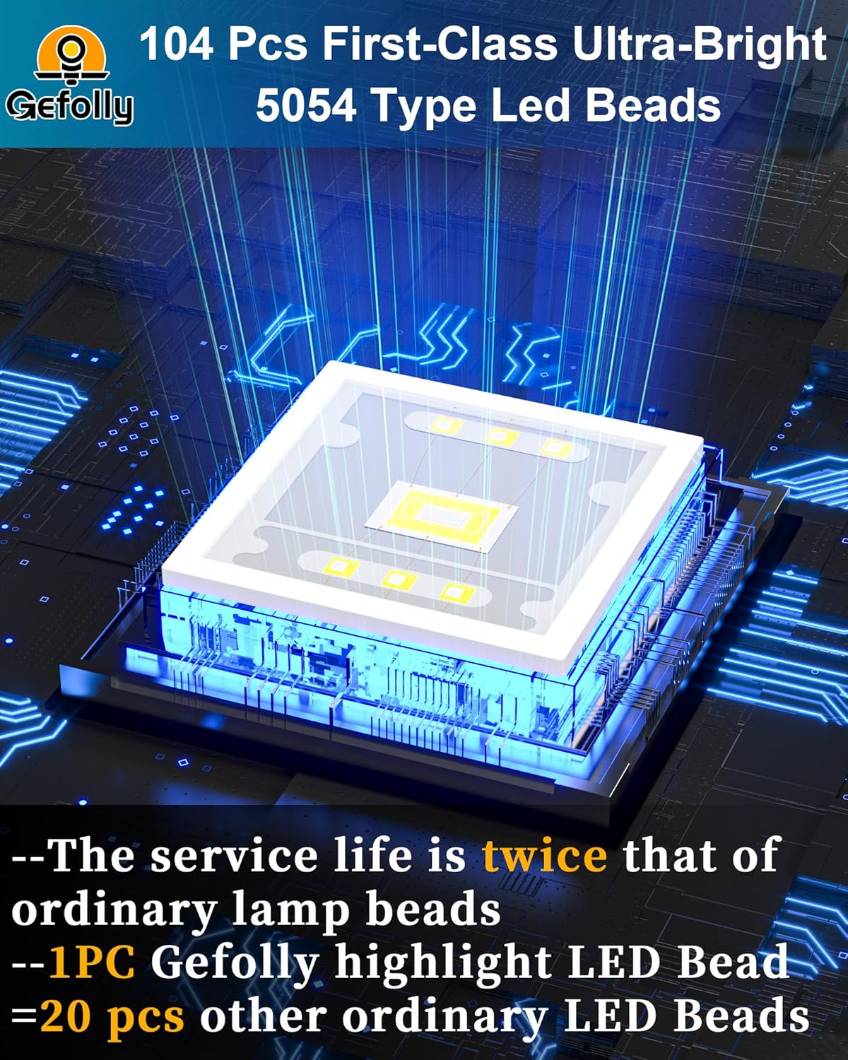 - [Ultra Bright 5054 Type Led Beads] - Designed with 104pcs first-class super bright 5054 type LED beads, 1 of our Gefolly beads is as bright as 20 ordinary beads. The lighting area is up to 3600 square feet, reducing lighting blind spots. Escort for the safety of you and your family. The first choice for night lighting.