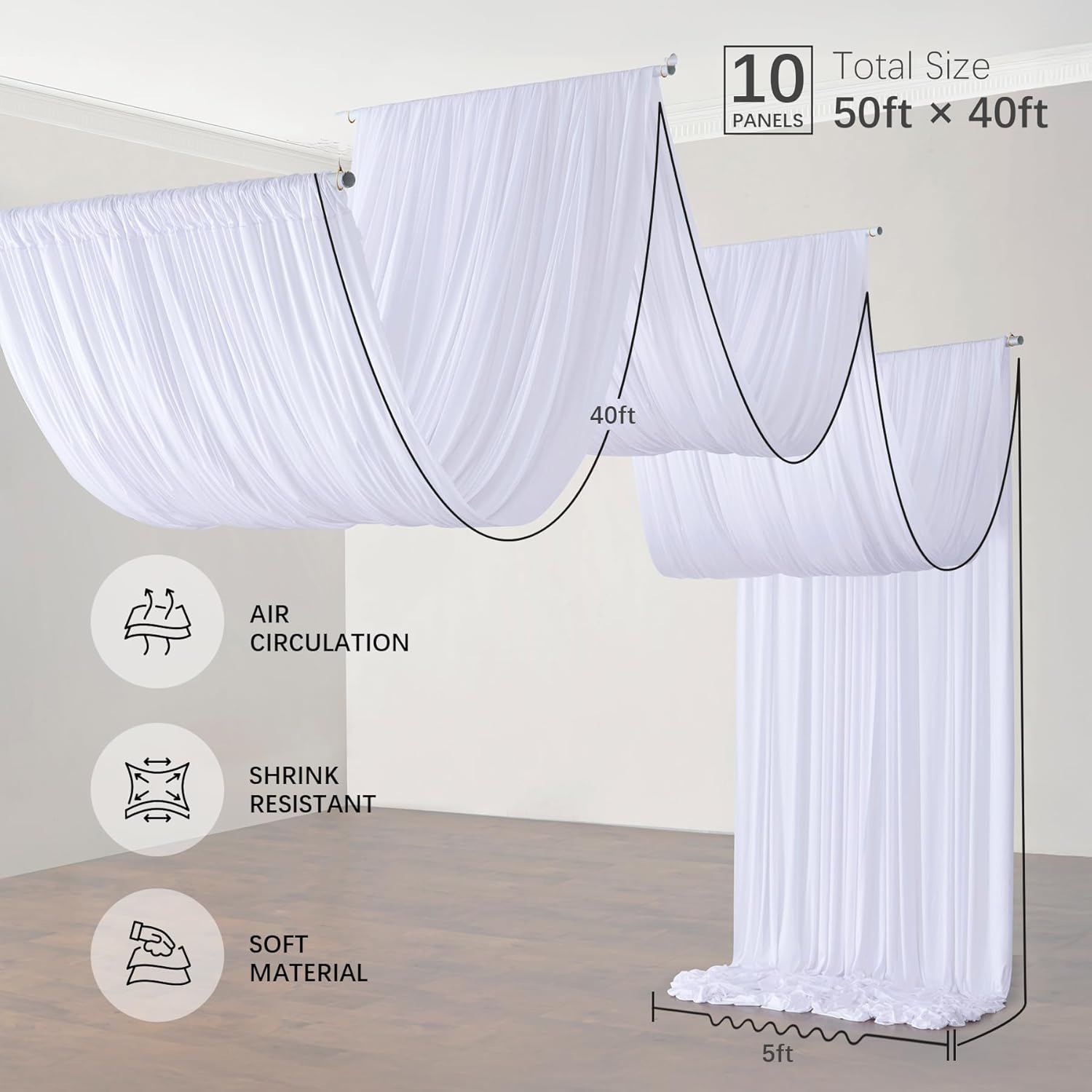 - 40ft Extra Long Ceiling Drapes: 10 Panels 5ftx40ft White Backdrop Curtains for Parties. Totally 50FT(Width) x 40FT(Height). cortinas para fiestas decoracion.
