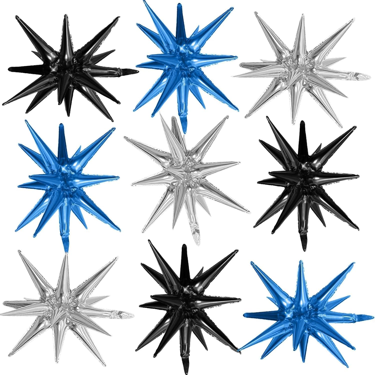 Black Blue Silver Star Balloons,9Pcs 22Inch Black Blue Silver Explosion Spike Cone Helium Polyester Film Star Foil Balloons for Birthday Anniversary Baby Shower Disco Party Decorations