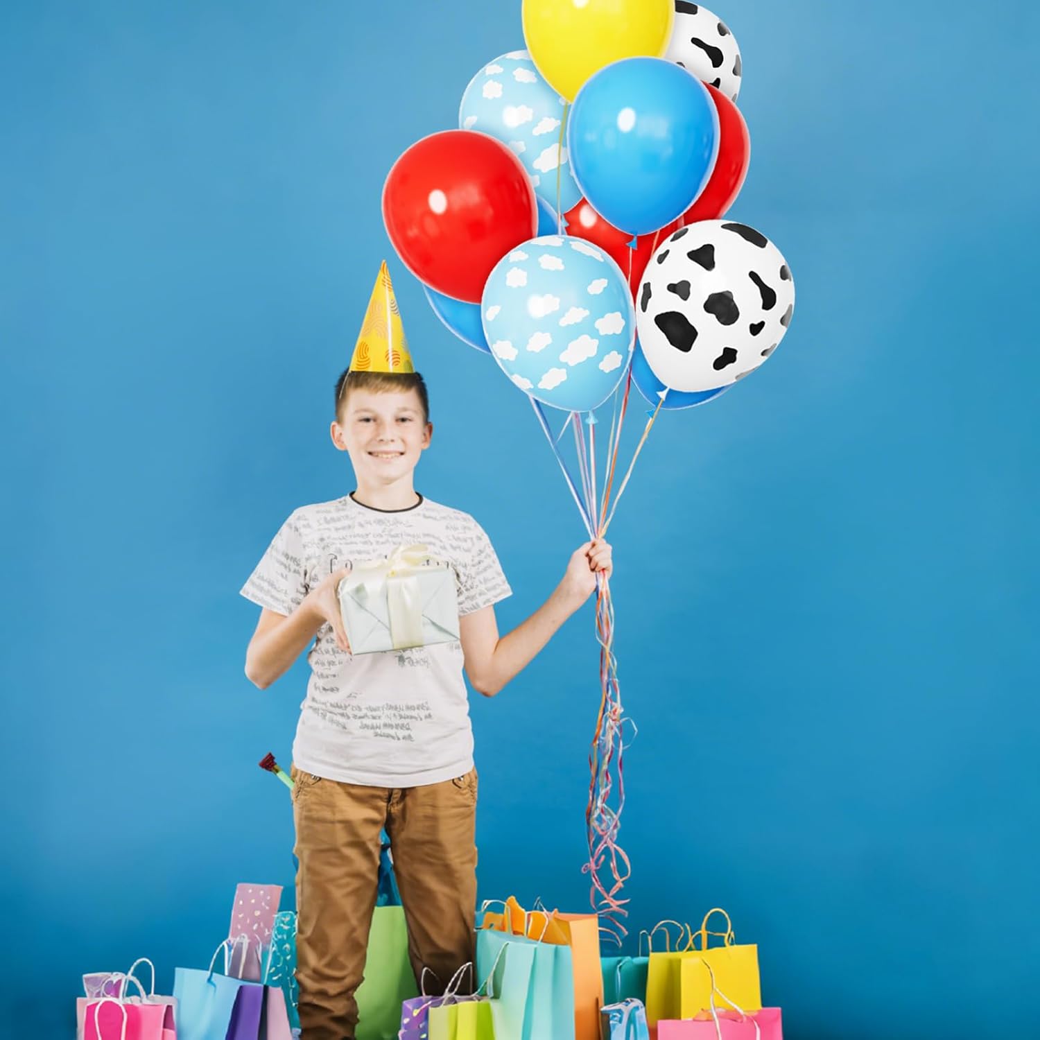 - ăBalloons Packing ă12 Inch balloons pack: Package includes 16 pcs light blue balloons, 16 pcs red balloons, 16 pcs yellow balloons,10 pcs cow balloons and 10 pcs could balloons with 2 ribbons.