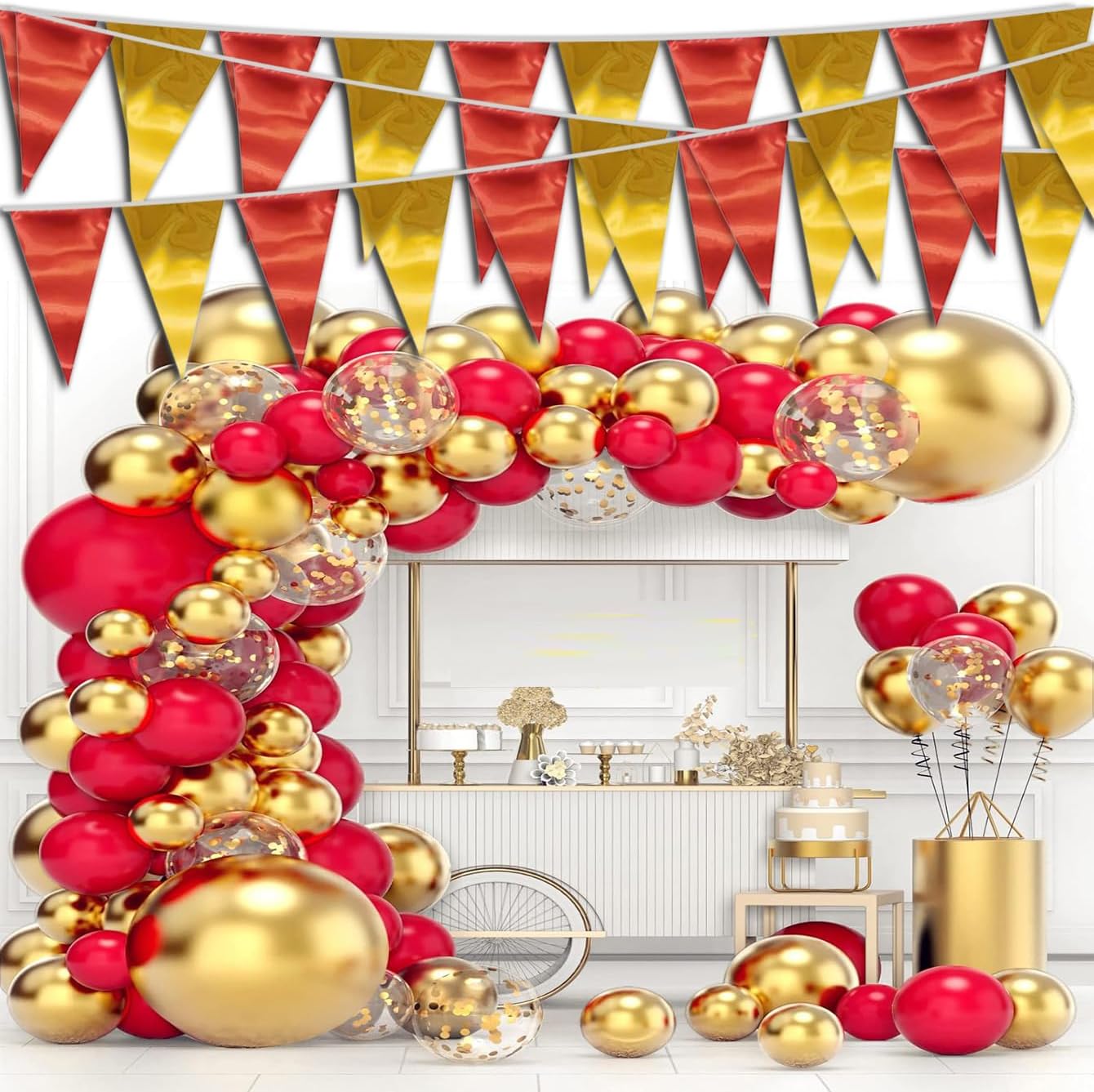 - 【Red Gold Pennant Bunting Set】: The total length of the Red Gold Triangle banner is 130 feet, divided into4 strips, each 32.8 feet long. Each Pennant Banner 80Flag Size: 7.87''/20cm width x 11.8''/30cm height for birthday decorations many occasions, and so on