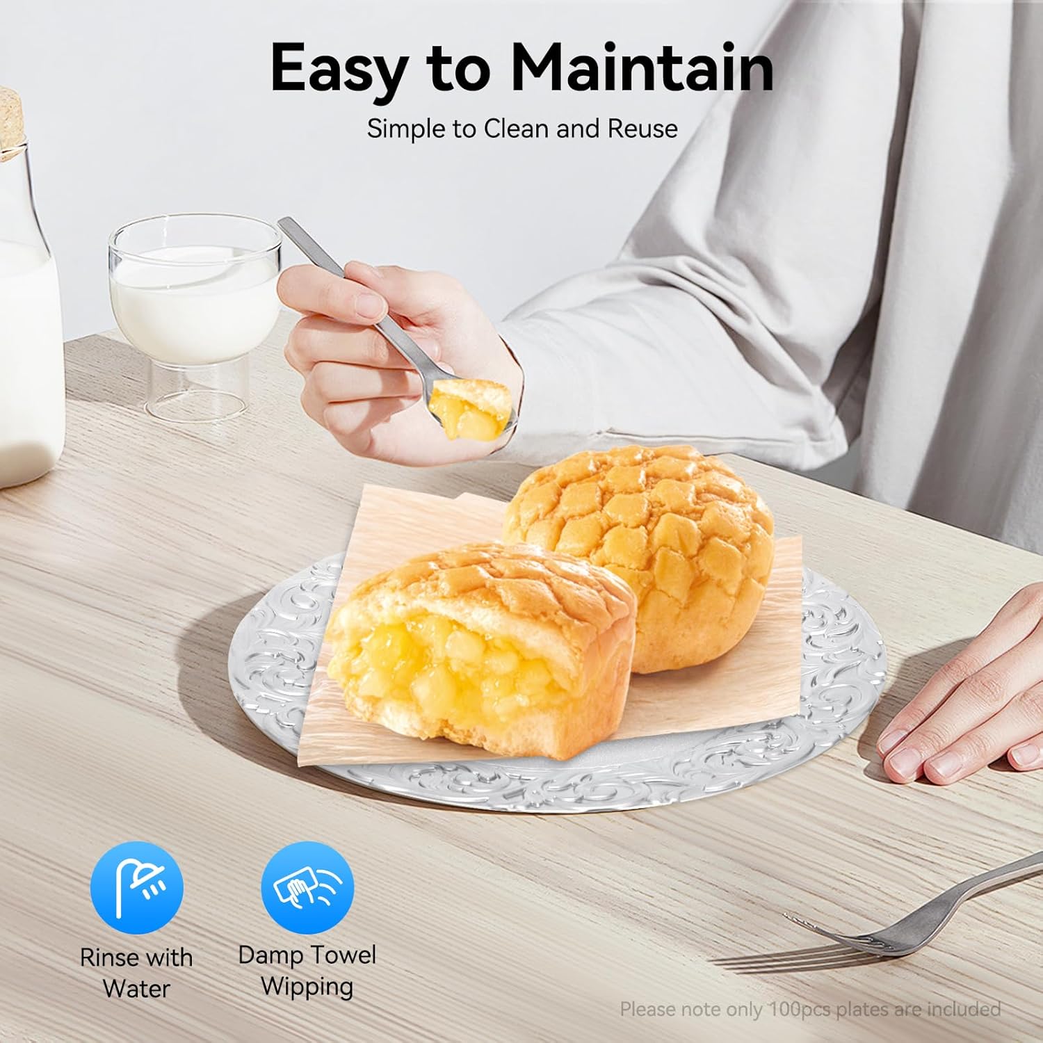Antique Charger Plates Set, 100 Pcs 13in Plastic Embossed Dinner Plate, Round Phoenix Pattern Elegant Floral Plates for Dinner Wedding Party Event Table Setting Decoration (Silver)