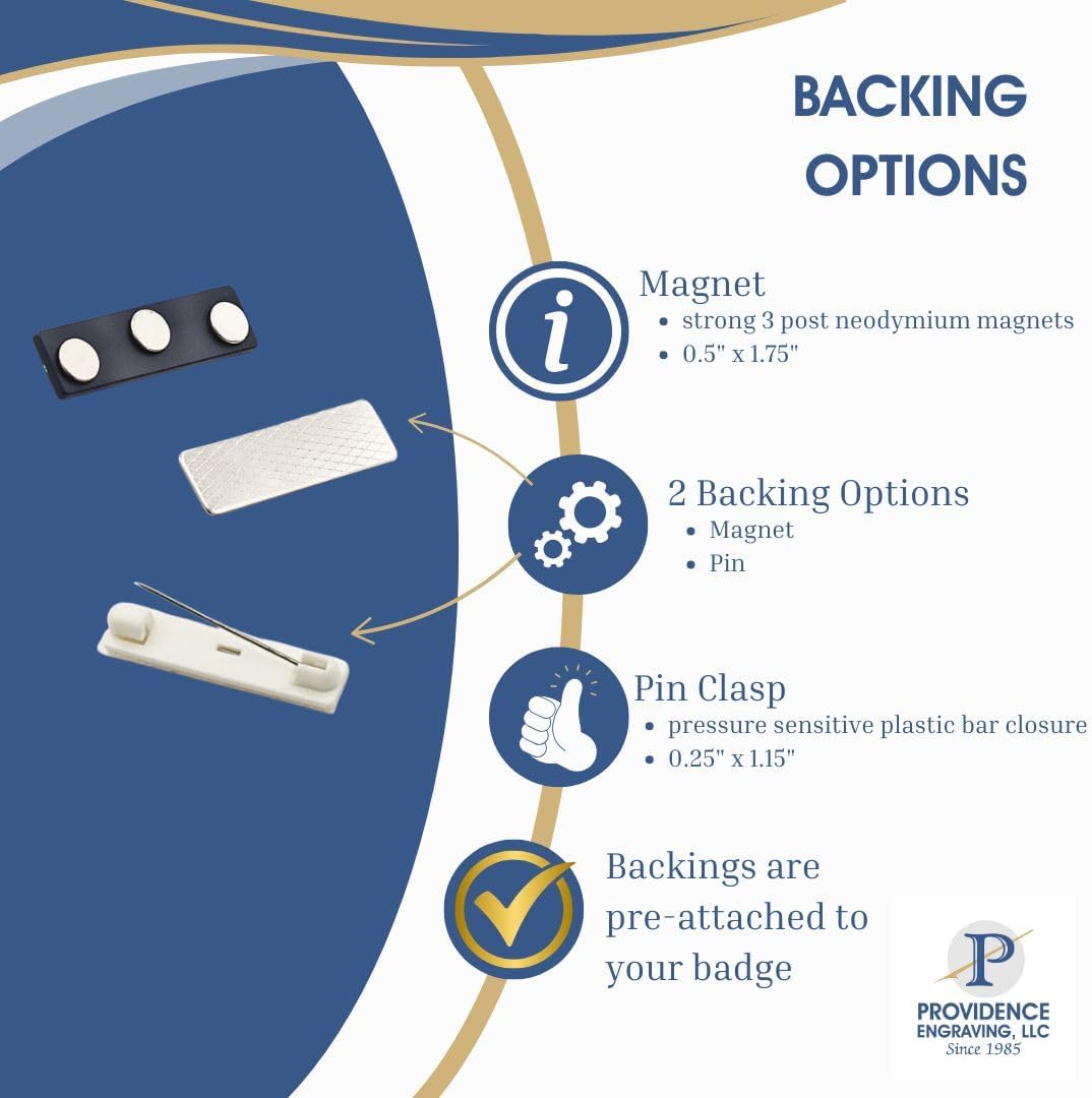 - These pins come in 4 different sizes, 1.5 inches by 3 inches, 1 inch by 3 inches, 2.8 inch oval, and 3.2 inch oval with a magnetic backing or a pin backing