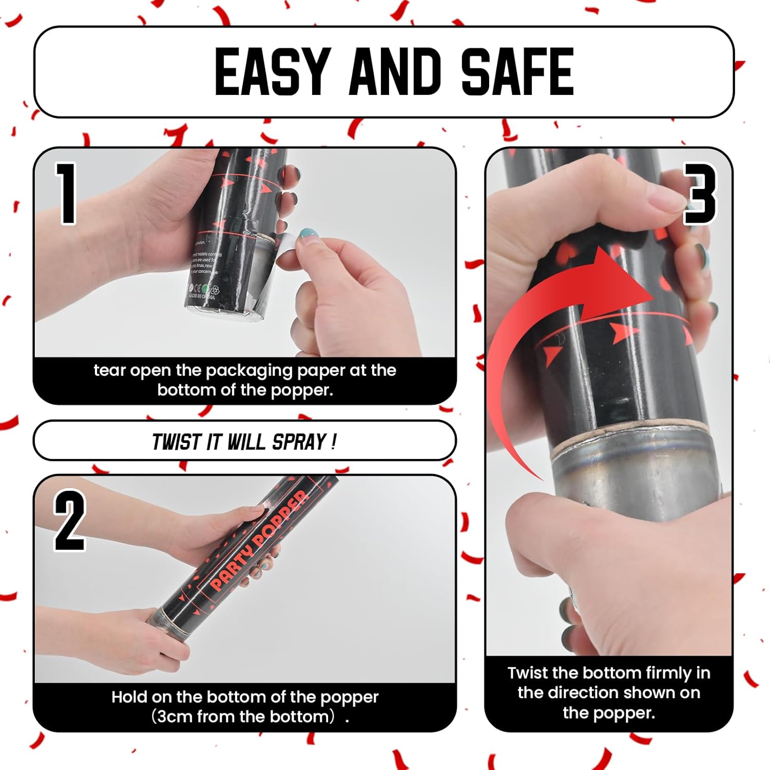 - Red Confetti Poppers - Find confetti cannon hard to twist to pop?Maybe you got a wrong way to use confetti poppers. To avoid awkward silence in the beginning, please read the instructions and tear open the packaging paper at the bottom of the popper, then easy to twist it!