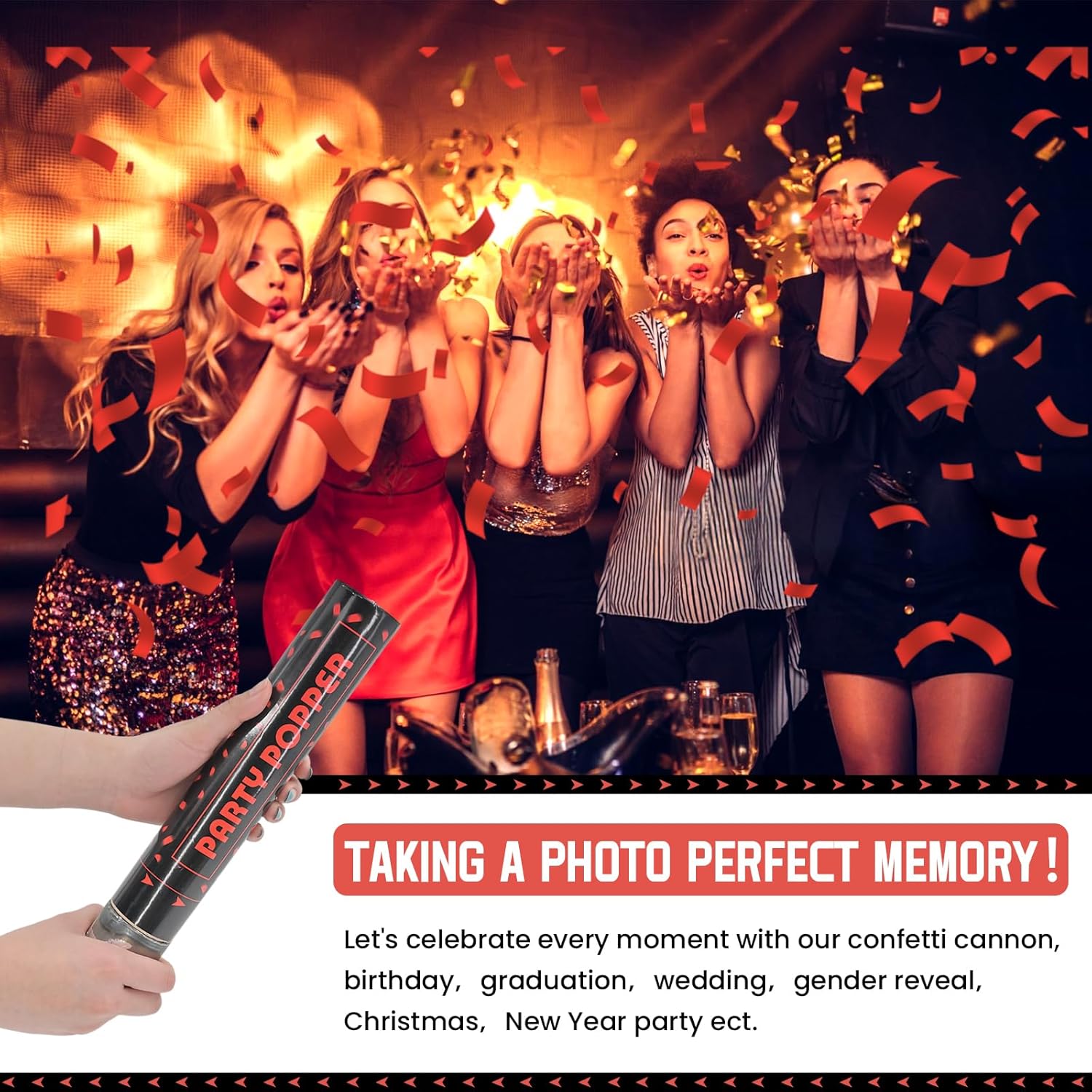 - Party Poppers with Red Confetti - Our red mylar confetti poppers are made of high quality confetti, ensuring a celebartion that's both fun and safe. Ideal for any occasion, form weddings and engagements to birthdays and anniversaries, graduation Christmas New Year party.