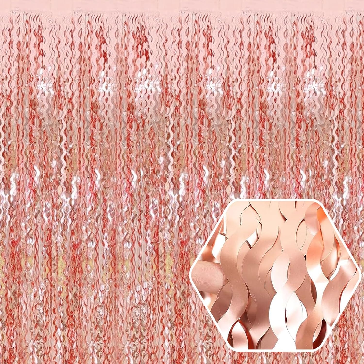4 Pack Rose Gold Wave Foil Fringe Curtain Backdrop, 3.28Ft x 8.2Ft Metallic Tinsel Foil Fringe Streamer Curtains for Photo Booth, Mother's Day, Easter, Birthday, Wedding Party Decoration