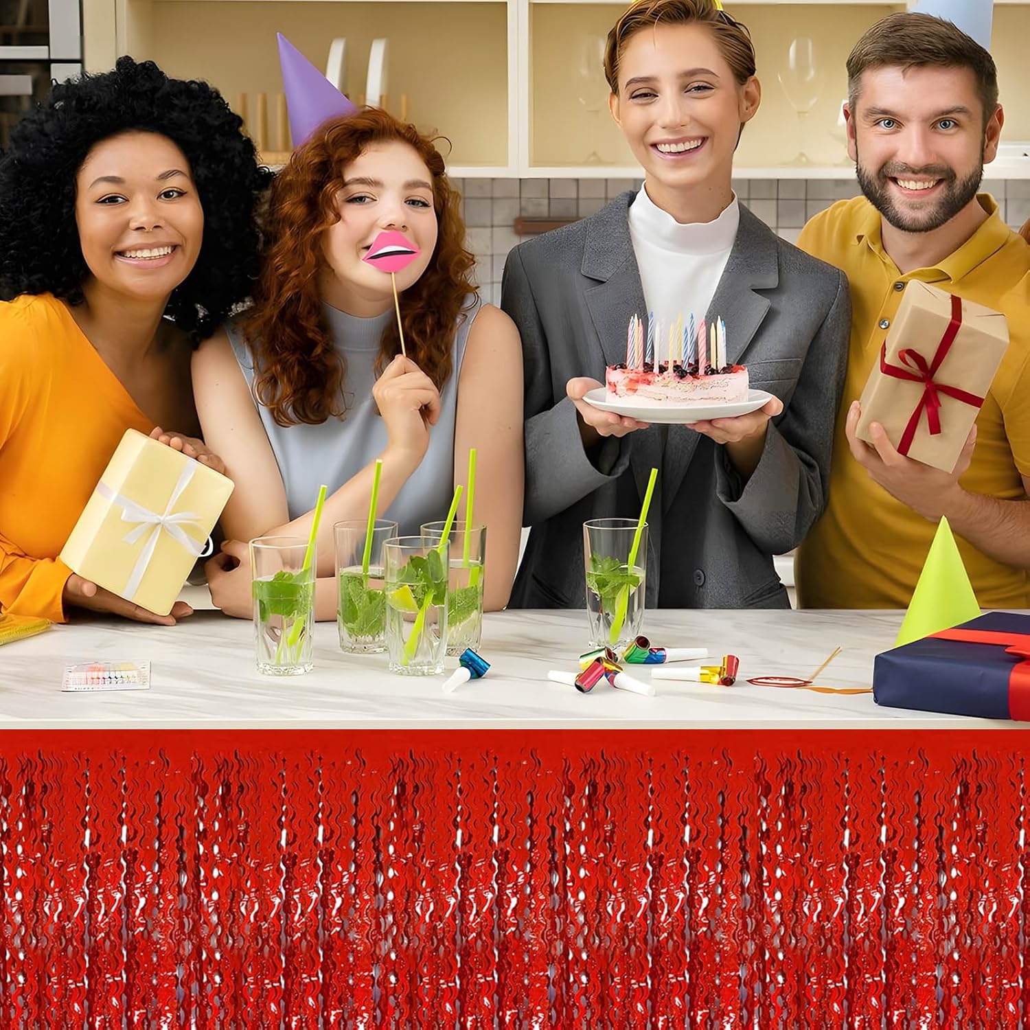 - Package Includes: 6pcs/set metallic fringe table skirts / shiny tassel banner, beautiful and shiny, provide you with great decoration effects, Each pack of table skirt measures 29x108 inches. Each one will be 9 Ft long, 6 pack will cover 54 FT length of tables.