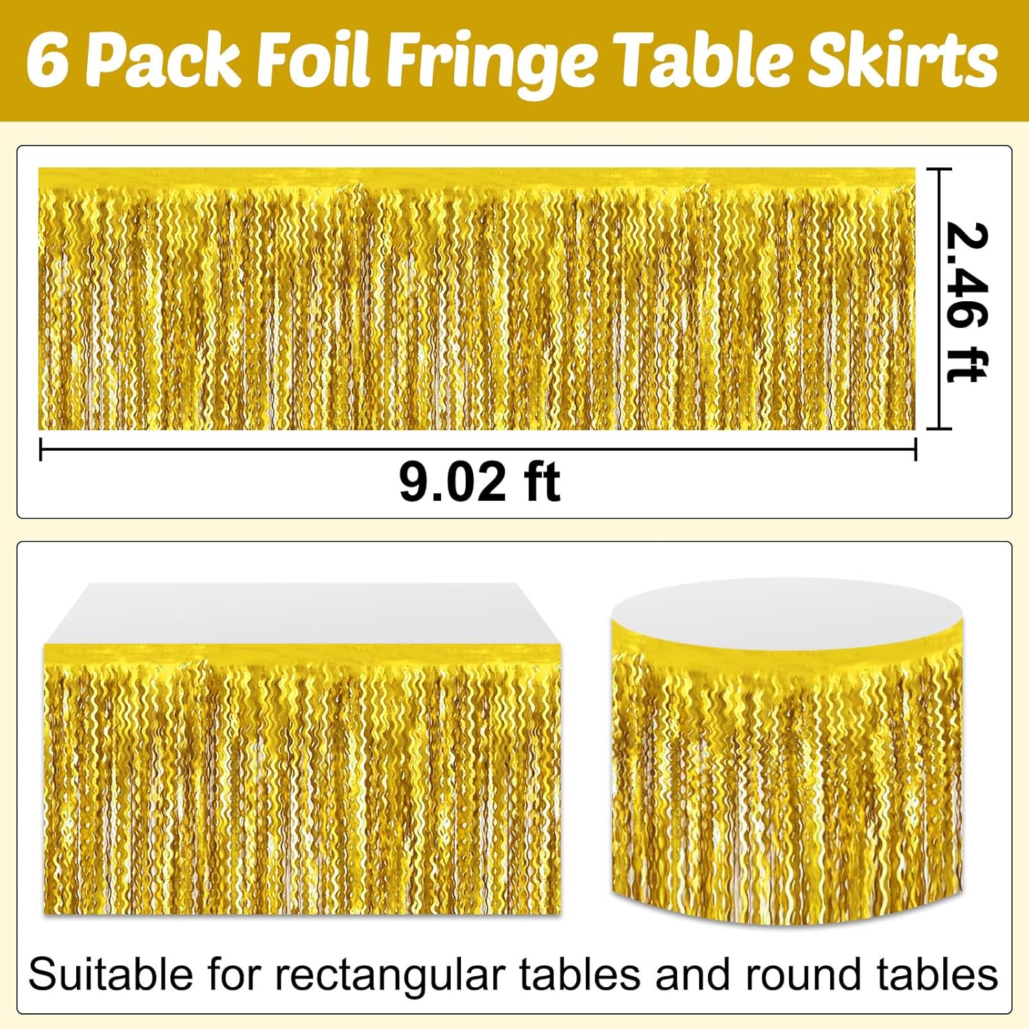 - Package Includes: 6pcs/set metallic fringe table skirts / shiny tassel banner, beautiful and shiny, provide you with great decoration effects, Each pack of table skirt measures 29x108 inches. Each one will be 9 Ft long, 6 pack will cover 54 FT length of tables.
