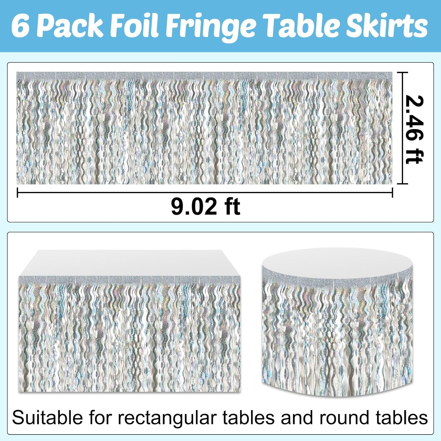 - Package Includes: 6pcs/set metallic fringe table skirts / shiny tassel banner, beautiful and shiny, provide you with great decoration effects, Each pack of table skirt measures 29x108 inches. Each one will be 9 Ft long, 6 pack will cover 54 FT length of tables.