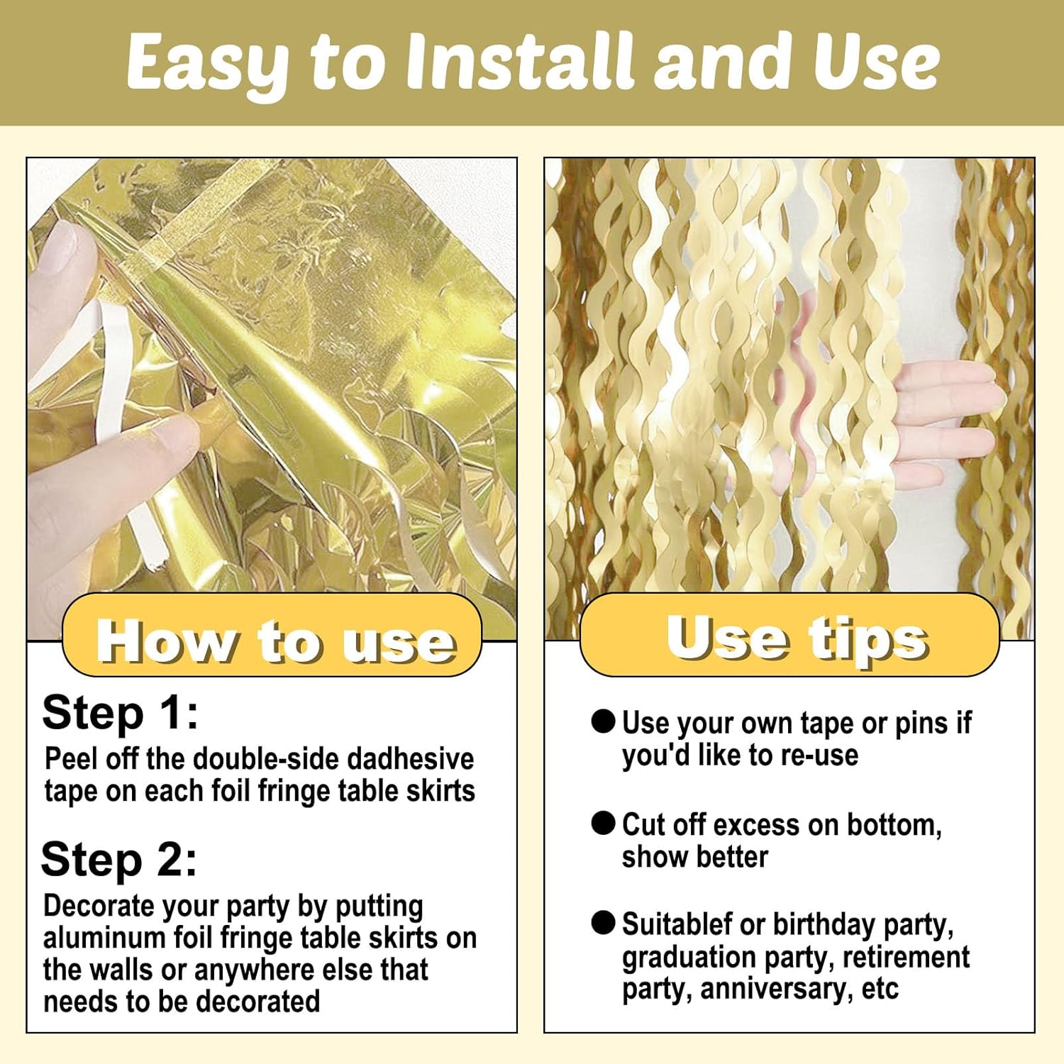 - Package Includes: 6pcs/set metallic fringe table skirts / shiny tassel banner, beautiful and shiny, provide you with great decoration effects, Each pack of table skirt measures 29x108 inches. Each one will be 9 Ft long, 6 pack will cover 54 FT length of tables.
